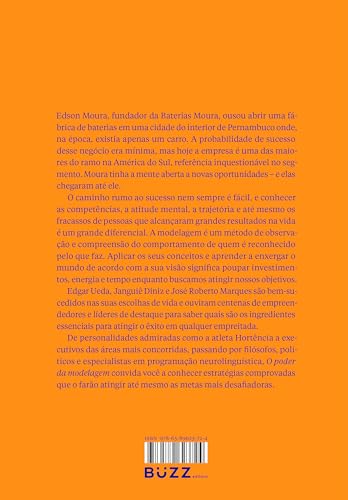 “Edson Moura, fundador da Baterias Moura, ousou abrir uma fábrica de baterias em uma cidade do interior de Pernambuco onde, na época, existia apenas um carro. A probabilidade de sucesso desse negócio era mínima, mas hoje a empresa é uma das maiores do ramo na América do Sul, referência inquestionável no segmento. Moura tinha a mente aberta a novas oportunidades — e elas chegaram até ele. O caminho rumo ao sucesso nem sempre é fácil, por isso conhecer as competências, a atitude mental, a trajetória e até mesmo os fracassos de pessoas que alcançaram grandes resultados na vida. A modelagem é um método de observação e compreensão do comportamento de quem é reconhecido pelo que faz. Aplicar os seus conceitos e aprender a enxergar o mundo de acordo com a sua visão significa poupar investimentos, energia e tempo enquanto buscamos atingir nossas metas. Edgar Ueda, Janguiê Diniz e José Roberto Marques são bem-sucedidos nas suas escolhas de vida e ouviram centenas de empreendedores e líderes de destaque para saber quais são os ingredientes essenciais para atingir o êxito em qualquer empreitada. De personalidades admiradas como a atleta Hortência a executivos das áreas mais concorridas, passando por filósofos, políticos e especialistas em programação neurolinguística, O poder da modelagem convida você a conhecer estratégias comprovadas que o farão atingir até mesmo as metas mais desafiadoras.”
