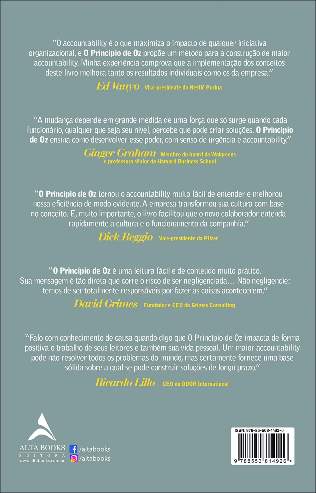 “Falo com conhecimento de causa quando digo que O Princípio de Oz impacta de forma positiva o trabalho de seus leitores e também sua vida pessoal. Um maior accountability pode não resolver todos os problemas do mundo, mas certamente fornece uma base sólida sobre a qual se pode construir soluções de longo prazo.”