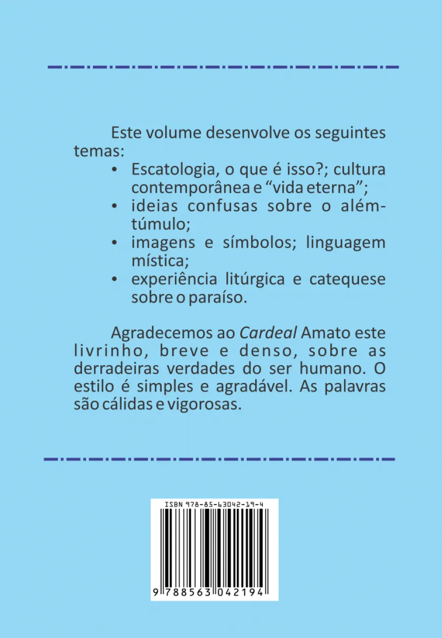 Este volume desenvolve os seguintes temas: – Escatologia, oque é isso?; cultura contemporânea e “vida eterna”; – ideias confusas sobre o além túmulo; – imagens e símbolos; linguagem mística; – experiência litúrgica e catequese sobre o paraíso.