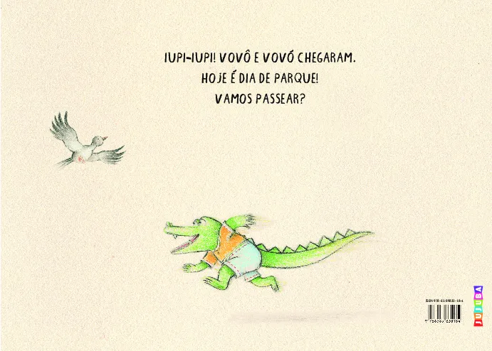Num passeio com os avós, o pequeno crocodilo passará por aventuras do universo dos bebês – a chegada dos avós para o passeio, a descoberta de uma flor, um passarinho que voa, até a hora mais esperada: a divisão de um brinquedo. E tudo com onomatopeias, que possibilitam, a cada virar de página, uma imersão em um universo da brincadeira.