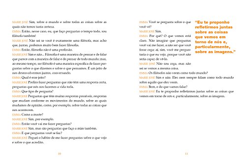 Escrito com base em encontros com alunos de escolas francesas ao longo de dois anos, este livro mostra a conversa de uma filósofa com uma menina a respeito de questões que fazem parte da vida de todos nós: o real e o imaginário, o absoluto e o relativo, os sentidos e a força das imagens e das palavras, o papel da mídia na veiculação da informação, a importância do diálogo e, sobretudo, da reflexão sobre o que vemos, lemos e ouvimos, sobre o que vivemos.