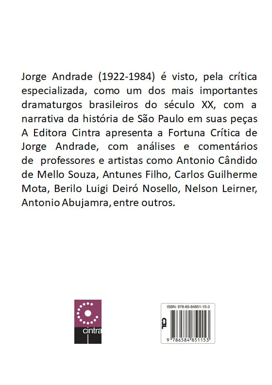 Jorge Andrade (1922-1984) é visto, pela crítica especializada, como um dos mais importantes dramaturgos brasileiros do século XX, com a narrativa da história de São Paulo em suas peças A Editora Cintra apresenta a Fortuna Crítica de Jorge Andrade, com análises e comentários de professores e artistas como Antonio Cândido de Mello Souza, Antunes Filho, Carlos Guilherme Mota, Berilo Luigi Deiró Nosello, Nelson Leirner, Antonio Abujamra, entre outros.