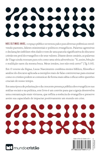 Nos últimos anos, o espaço público se tornou palco para diversas polêmicas envolvendo pastores, líderes ministeriais e políticos evangélicos. Palavras agressivas e declarações infelizes têm dado o tom de uma parcela significativa do discurso cristão em prol do evangelho e de seus valores. Diante desse cenário, as palavras de Tiago ainda ressoam para nós como uma séria advertência: “E, assim, bênção e maldição saem da mesma boca. Meus irmãos, isso não está certo!” (Tg 3.10). Em O veneno da língua, Lucas Nascimento combina ensino bíblico, filosofia e análise do discurso aplicada a exemplos reais de falas controversas para ensinar como os cristãos podem se comunicar de forma mais sábia e eficaz sobre questões cruciais de nosso tempo. Em uma época de polarização e da crescente presença pública dos evangélicos nas mídias sociais e na política, este livro é um convite para que igreja desenvolva uma comunicação mais virtuosa, que reflita a essência do evangelho e preserve assim sua capacidade de impactar positivamente um mundo em crise.