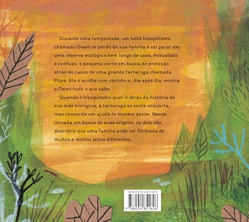 Inspirado em uma história real, este é um livro emocionante sobre família, afeto e pertencimento escrito pela autora best-seller de Malala, uma menina que queria ir para a escola, e ilustrado pela artista plástica Isabela Santos. Durante uma tempestade, um bebê hipopótamo chamado Owen se perde de sua família e vai parar em uma reserva ecológica bem longe de casa. Assustado e confuso, o pequeno corre em busca de proteção atrás do casco de uma grande tartaruga, Mzee. Ela o acolhe com carinho e, dia após dia, ensina a Owen tudo o que sabe. Quando o hipopótamo quer ir atrás da história da sua família biológica, a tartaruga se sente esquisita, mas concorda em ajudá-lo mesmo assim. E nessa jornada em busca de suas origens, os dois vão descobrir que uma família pode ser formada de muitos e muitos jeitos diferentes. Nesta história emocionante, inspirada em fatos reais, Adriana Carranca convida seus leitores a refletirem sobre o conceito de família e a adoção de maneira lúdica e delicada. As artes de Isabela Santos, recheadas de referências, narram a história junto com o texto. Ao final, além de um posfácio contando sobre a história real do hipopótamo Owen e da tartaruga Mzee, Adriana também reúne muitas referências para pais e crianças que adotaram e foram adotados. Indicado para leitores a partir de 4 anos.