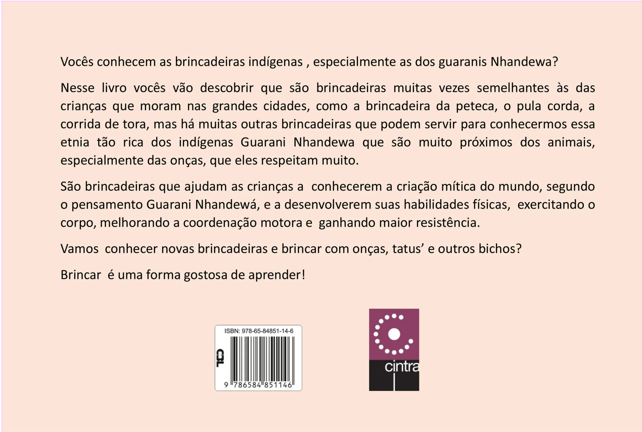 Nesse livro vocês vão descobrir que são brincadeiras muitas vezes semelhantes às das crianças que moram nas grandes cidades, como a brincadeira da peteca, o pula corda, a corrida de tora, mas há muitas outras brincadeiras que podem servir para conhecermos essa etnia tão rica dos indígenas guaranis Nhandewá que são muito próximos dos animais, especialmente das onças, que eles respeitam muito.