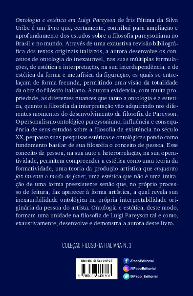 Através do estudo e análise aprofundados dos textos originais italianos, a autora nos brinda com os conceitos específicos dessa filosofia; como a ontologia e a estética, além de uma visão completa da obra do autor italiano Luigi Pareyson.