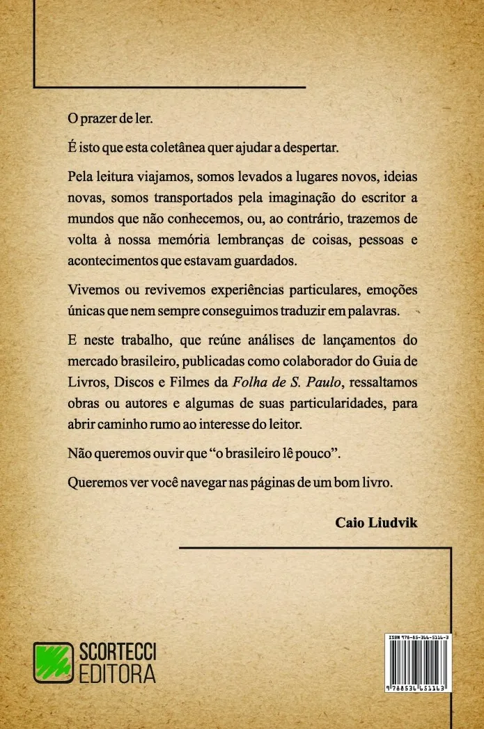 O prazer de ler. É isto que esta coletânea quer ajudar a despertar. Pela leitura viajamos, somos levados a lugares novos, ideias novas, somos transportados pela imaginação do escritor a mundos que não conhecemos, ou, ao contrário, trazemos de volta à nossa memória lembranças de coisas, pessoas e acontecimentos que estavam guardados. Vivemos ou revivemos experiências particulares, emoções únicas que nem sempre conseguimos traduzir em palavras. E neste trabalho, que reúne análises de lançamentos do mercado brasileiro, publicadas como colaborador do Guia de Livros, Discos e Filmes da Folha de S. Paulo, ressaltamos obras ou autores e algumas de suas particularidades, para abrir caminho rumo ao interesse do leitor. Não queremos ouvir que “o brasileiro lê pouco”. Queremos ver você navegar nas páginas de um bom livro.