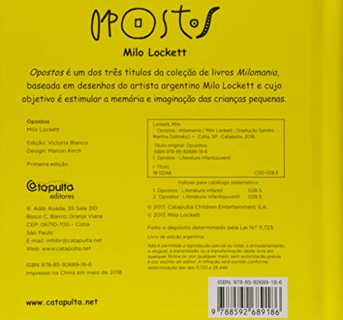 Opostos é um dos três títulos da coleção de livros Milomania, baseada em desenhos do artista argentino Milo Lockett e cujo objetivo é estimular a memória e imaginação das crianças pequenas.