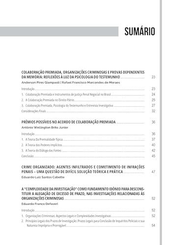 Contém discussões teóricas e práticas, como a colaboração premiada, a psicologia do testemunho, a infiltração de agentes, a investigação cibernética, a jurisprudência internacional, a evolução conceitual e o estelionato digital, dentre outros.