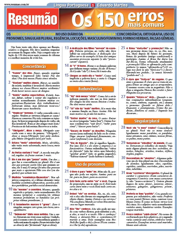 O Resumão Os 150 Erros Mais Comuns é um guia prático que enumera os erros que você deve evitar no uso diário da língua portuguesa. Erros de concordância. Redundância. O uso de pronomes. Singular e plural. Os erros mais frequentes de ortografia. Erros de regência e uso incorreto de locuções. Parônimas, as falsas gêmeas. As formas verbais, masculino e feminino. Palavras mal usadas. Destaque para uma lista de 15 erros que você deve evitar a todo custo. Atualizado de acordo com as novas regras de ortografia.