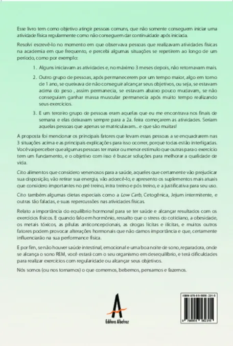 Esse livro tem como objetivo atingir pessoas comuns, que não somente conseguem iniciar uma atividade física regularmente como não conseguem dar continuidade após iniciada. Resolvi escrevê-lo no momento em que observava pessoas que realizavam atividades físicas na academia em que frequento, e percebi algumas situações se repetirem ao longo de um período, como por exemplo: 1. Alguns iniciavam as atividades e, no máximo 3 meses depois, não retornavam mais. 2. Outro grupo de pessoas, após permanecerem por um tempo maior, algo em torno de 1 ano, se queixava de não conseguir alcançar seus objetivos, ou seja, se estavam acima do peso , assim permanecia, se estavam abaixo pouco mudavam, se não conseguiam ganhar massa muscular permanecia após muito tempo realizando seus exercícios. 3. E um terceiro grupo de pessoas eram aquelas que eu me encontrava nos finais de semana e elas deixavam sempre para a 2a. feira começarem as atividades. Seriam aquelas pessoas que apenas se matriculavam… e que são muitas! A proposta foi mencionar os principais fatores que levam essas pessoas a se enquadrarem nas 3 situações acima e as principais explicações para isso ocorrer, porque todas estão interligadas. Você vai perceber que algumas pessoas ter maior ou menor estímulo que outras para o exercício tem um fundamento, e o objetivo com isso é buscar soluções para melhorar a qualidade de vida. Cito alimentos que considero venenosos para a saúde, aqueles que certamente vão prejudicar sua disposição, vão retirar sua energia, vão adoecê-lo, e apresento os suplementos mais atuais que considero importantes no pré treino, intra treino e pós treino, e a justificativa para seu uso. Cito também algumas dietas especiais como a Low Carb, Cetogênica, Jejum intermitente, e outras tão faladas, e suas repercussões nas atividades físicas. Relato a importância do equilíbrio hormonal para se ter saúde e alcançar resultados com os exercícios físicos. E quando falo em hormônio, ressalto que o stress do cotidiano, a obesidade, os metais tóxicos, as pílulas anticoncepcionais, as drogas lícitas e ilícitas, e muitos outros fatores podem provocar alterações hormonais que não damos importância e que, certamente influenciarão na sua performance física. E por fim, se não houver saúde intestinal, emocional e uma boa noite de sono, reparadora, onde se alcança o sono REM, você estará com o seu organismo em desequilíbrio, e terá dificuldades para realizar exercícios com regularidade ou alcançar seus objetivos. Nós somos (ou nos tornamos) o que comemos, bebemos, pensamos e fazemos.