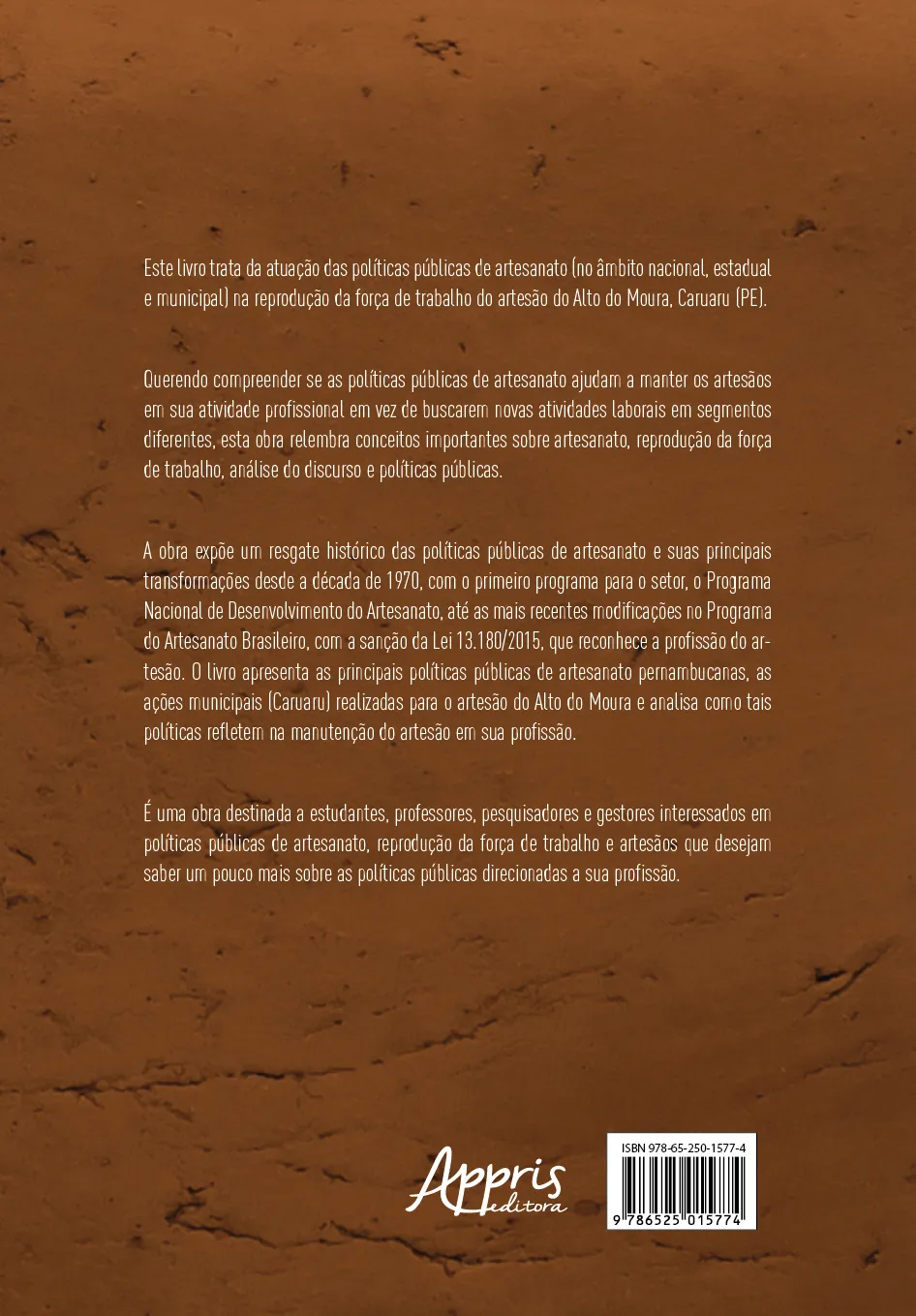 Este livro trata da atuação das políticas públicas de artesanato (no âmbito nacional, estadual e municipal) na reprodução da força de trabalho do artesão do Alto do Moura, Caruaru (PE). Querendo compreender se as políticas públicas de artesanato ajudam a manter os artesãos em sua atividade profissional em vez de buscarem novas atividades laborais em segmentos diferentes, esta obra relembra conceitos importantes sobre artesanato, reprodução da força de trabalho, análise do discurso e políticas públicas. A obra expõe um resgate histórico das políticas públicas de artesanato e suas principais transformações desde a década de 1970, com o primeiro programa para o setor, o Programa Nacional de Desenvolvimento do Artesanato, até as mais recentes modificações no Programa do Artesanato Brasileiro, com a sanção da Lei 13.180/2015, que reconhece a profissão do artesão. O livro apresenta as principais políticas públicas de artesanato pernambucanas, as ações municipais (Caruaru) realizadas para o artesão do Alto do Moura e analisa como tais políticas refletem na manutenção do artesão em sua profissão. É uma obra destinada a estudantes, professores, pesquisadores e gestores interessados em políticas públicas de artesanato, reprodução da força de trabalho e artesãos que desejam saber um pouco mais sobre as políticas públicas direcionadas a sua profissão.