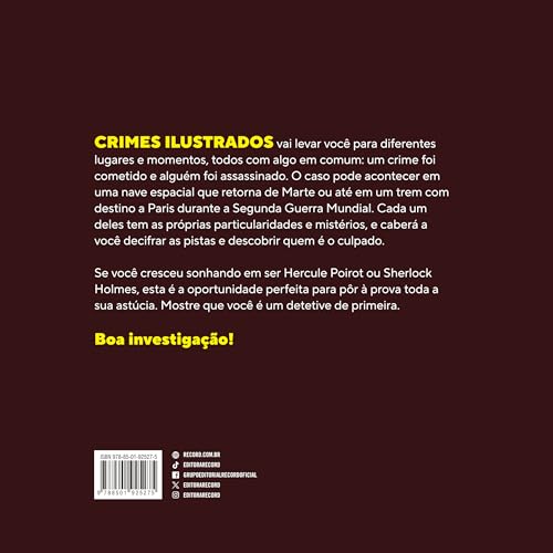 Um crime foi cometido e alguém foi assassinado. Em Outros crimes ilustrados, pegue sua lupa e sua roupa de detetive e solucione 12 casos inéditos, que vão de Marte até um trem durante a Segunda Guerra Mundial. Interativo e colaborativo, o livro é a diversão perfeita para uma noite de jogos. Você é o detetive, e a investigação está em suas mãos!