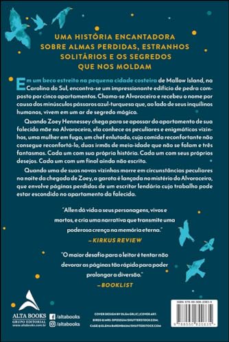 UMA HISTÓRIA ENCANTADORA SOBRE ALMAS PERDIDAS, ESTRANHOS SOLITÁRIOS E OS SEGREDOS QUE OS MOLDAM Em um beco estreito na pequena cidade costeira de Mallow Island, na Carolina do Sul, encontra-se um impressionante edifício de pedra composto por cinco apartamentos. Chama-se Alvoroceiro e recebeu o nome por causa dos minúsculos pássaros azul-turquesa que, ao lado de seus inquilinos humanos, vivem em um ar de segredo mágico. Quando Zoey Hennessey chega para se apossar do apartamento de sua falecida mãe no Alvoroceiro, ela conhece os peculiares e enigmáticos vizinhos, uma mulher em fuga, um chef enlutado, cuja comida reconfortante não consegue reconfortá-lo, duas irmãs de meia-idade que não se falam e três fantasmas. Cada um com sua própria história. Cada um com seus próprios desejos. Cada um com um final ainda não escrito. Quando uma de suas novas vizinhas morre em circunstâncias peculiares na noite da chegada de Zoey, a garota é lançada no mistério do Alvoroceiro, que envolve páginas perdidas de um escritor lendário cujo trabalho pode estar escondido no apartamento da falecida. “Allen dá vida a seus personagens, vivos e mortos, e cria uma narrativa que transmite uma poderosa crença na memória eterna.” —KIRKUS REVIEW “O maior desafio para o leitor é tentar não devorar as páginas tão rápido para poder prolongar a diversão.” —BOOKLIST
