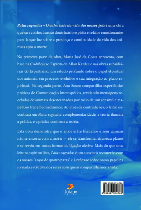 Patas sagradas – O outro lado da vida dos nossos pets é uma obra que une conhecimento doutrinário espírita e relatos emocionantes para lançar luz sobre a presença e continuidade da vida dos animais após a morte. Na primeira parte da obra, Maria José da Costa apresenta, com base na Codificação Espírita de Allan Kardec e nas obras subsidiárias do Espiritismo, um estudo profundo sobre o papel espiritual dos animais, seu processo evolutivo e sua integração ao plano espiritual. Na segunda parte, Ana Cristina Souza compartilha experiências práticas de Comunicação Interespécies, revelando mensagens recebidas de animais desencarnados por meio de um sensível e respeitoso trabalho mediúnico. Ao invés de contradições, o leitor encontrará em Patas sagradas complementaridade: a teoria ilumina a prática, e a prática confirma a teoria. Esta obra demonstra que o amor entre humanos e seus animais não se encerra com a morte — ele se transforma, atravessa planos e se revela em novas formas de ligação afetiva. Mais do que uma leitura espiritualista, Patas sagradas é um convite à reconexão com os nossos “anjos de quatro patas” e à reflexão sobre nosso papel na jornada evolutiva dos seres com quem compartilhamos a vida.