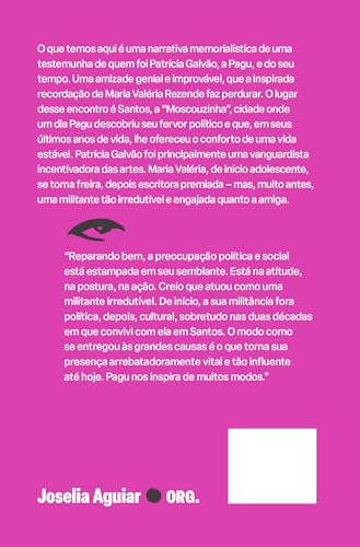 Nesta narrativa memorialísitica, conhecemos Patrícia Galvão, a Pagu, pelos olhos de Maria Valéria Rezende e descobrimos os caminhos que transformaram as duas amigas em militantes irredutíveis. Esse perfil de Patrícia Galvão é o retrato de um país e de uma era. Uma narrativa memorialística emocionante sobre pessoas que acreditam na ação social, por isso, se veem às voltas com fugas e prisões, correndo risco de morrer e apostam nos livros. Por esse percurso, vemos os modernistas entrar em cena; depois, os dias de opressão do Estado Novo. Os lares sem televisão, a Escola Normal. A imprensa brasileira ganhando forma e conteúdo. O início das lutas e conquistas das mulheres. Maria Valéria Rezende, hoje escritora premiada, era menina quando conheceu Patrícia, em Santos, no início da década de 1950. A princípio, assim mesmo, pura e simplesmente “Patrícia”. A amizade começou no Teatro Coliseu e se esticou até o Bar Regina, frequentado por artistas e pelos rapazes do Partido Comunista. Maria Valéria escutava o que a amiga mais sabida e experiente lhe dizia e, a partir de seu olhar, aprendeu a enxergar muito além. Não só o que estava em cartaz no teatro, ou o cotidiano da cena cultural santista, mas o que se passava no mundo. Na tarefa de recordar a amiga, Maria Valéria nos conta sobre as facetas por trás de cada nome. Mais até do que uma mulher liberta, Pagu – como ficou conhecida – se tornou um ser político, atuando em todas as frentes, e, extrapolando a política, se entregou à atuação social e artística. Quando se trata da vida de Maria Valéria, enxergamos também uma disposição incansável de mobilizar. Essas são memórias afetivas e apaixonadas. Não suscitam paixão apenas pela figura de Patrícia Galvão, mas também pela militância que retratada e retratista pulsam. Ambas lutam por uma realidade ideal. Por isso, a narrativa de Maria Valéria Rezende sobre Pagu muitas vezes fala de si, afinal, há uma convergência de espírito, um ímã que une essas duas mulheres inconformadas, essas duas militantes irredutíveis.