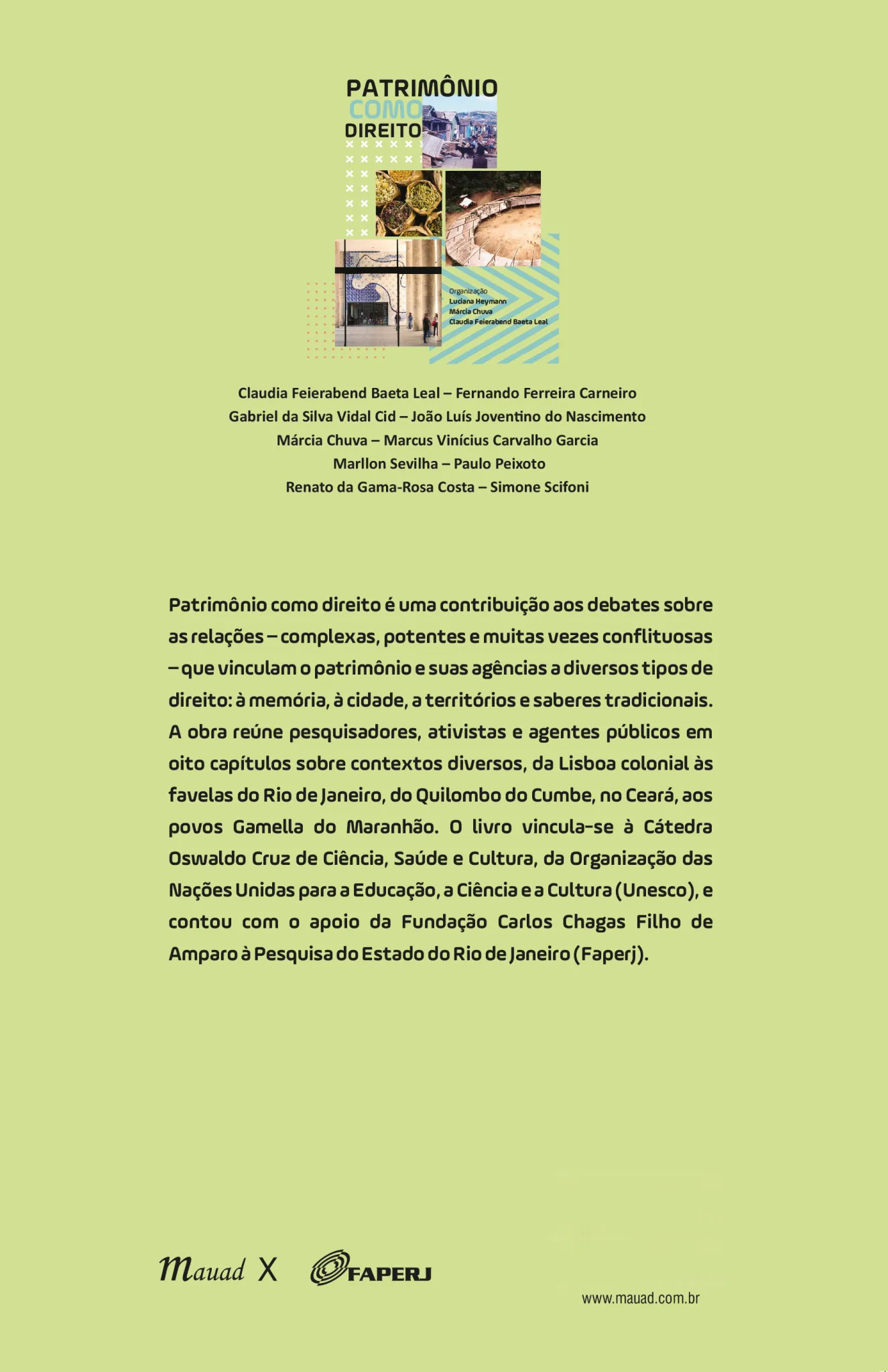 Patrimônio como direito é uma contribuição aos debates sobre as relações – complexas, potentes e muitas vezes conflituosas – que vinculam o patrimônio e suas agências a diversos tipos de direito: à memória, à cidade, a territórios e saberes tradicionais. O livro apresenta um mosaico dos desafios para o campo do patrimônio na contemporaneidade. Olhar em direção a qualquer parte do país – região, bioma, território, cidade, ambiente urbano ou rural – sob a ótica do patrimônio exige lançar luz sobre as pessoas, os sujeitos, aqueles que formam o tecido social, algo nem sempre evidente nas políticas públicas. Nesse sentido, esta obra problematiza a ausência dos humanos, aqueles que forjam conhecimentos, criam objetos e integram a cultura.