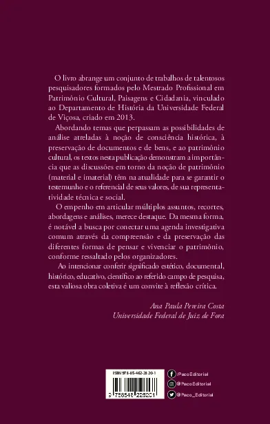 O livro abrange um conjunto de trabalhos de talentosos pesquisadores formados pelo Mestrado Profissional em Patrimônio Cultural, Paisagens e Cidadania, vinculado ao Departamento de História da Universidade Federal de Viçosa, criado em 2013. Abordando temas que perpassam as possibilidades de análise atreladas à noção de consciência histórica, à preservação de documentos e de bens, e ao patrimônio cultural, os textos nesta publicação demonstram a importância que as discussões em torno da noção de patrimônio (material e imaterial) têm na atualidade para se garantir o testemunho e o referencial de seus valores, de sua representatividade técnica e social.