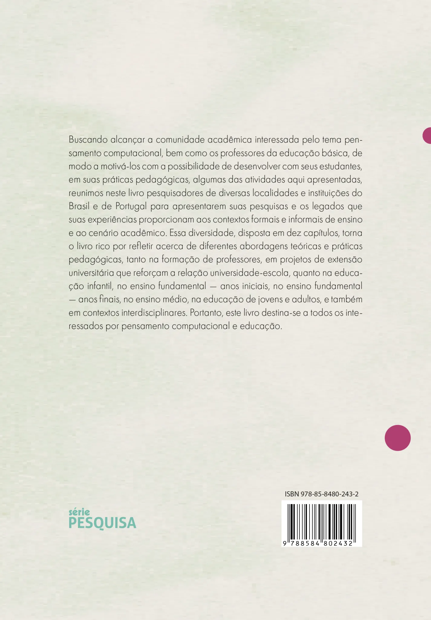 Buscando alcançar a comunidade acadêmica interessada pelo tema pensamento computacional, bem como os professores da educação básica, de modo a motivá-los com a possibilidade de desenvolver com seus estudantes, em suas práticas pedagógicas, algumas das atividades aqui apresentadas, reunimos neste livro pesquisadores de diversas localidades e instituições do Brasil e de Portugal para apresentarem suas pesquisas e os legados que suas experiências proporcionam aos contextos formais e informais de ensino e ao cenário acadêmico. Essa diversidade, disposta em dez capítulos, torna o livro rico por refletir acerca de diferentes abordagens teóricas e práticas pedagógicas, tanto na formação de professores, em projetos de extensão universitária que reforçam a relação universidade-escola, quanto na educação infantil, no ensino fundamental — anos iniciais, no ensino fundamental — anos finais, no ensino médio, na educação de jovens e adultos, e também em contextos interdisciplinares. Portanto, este livro destina-se a todos os interessados por pensamento computacional e educação.