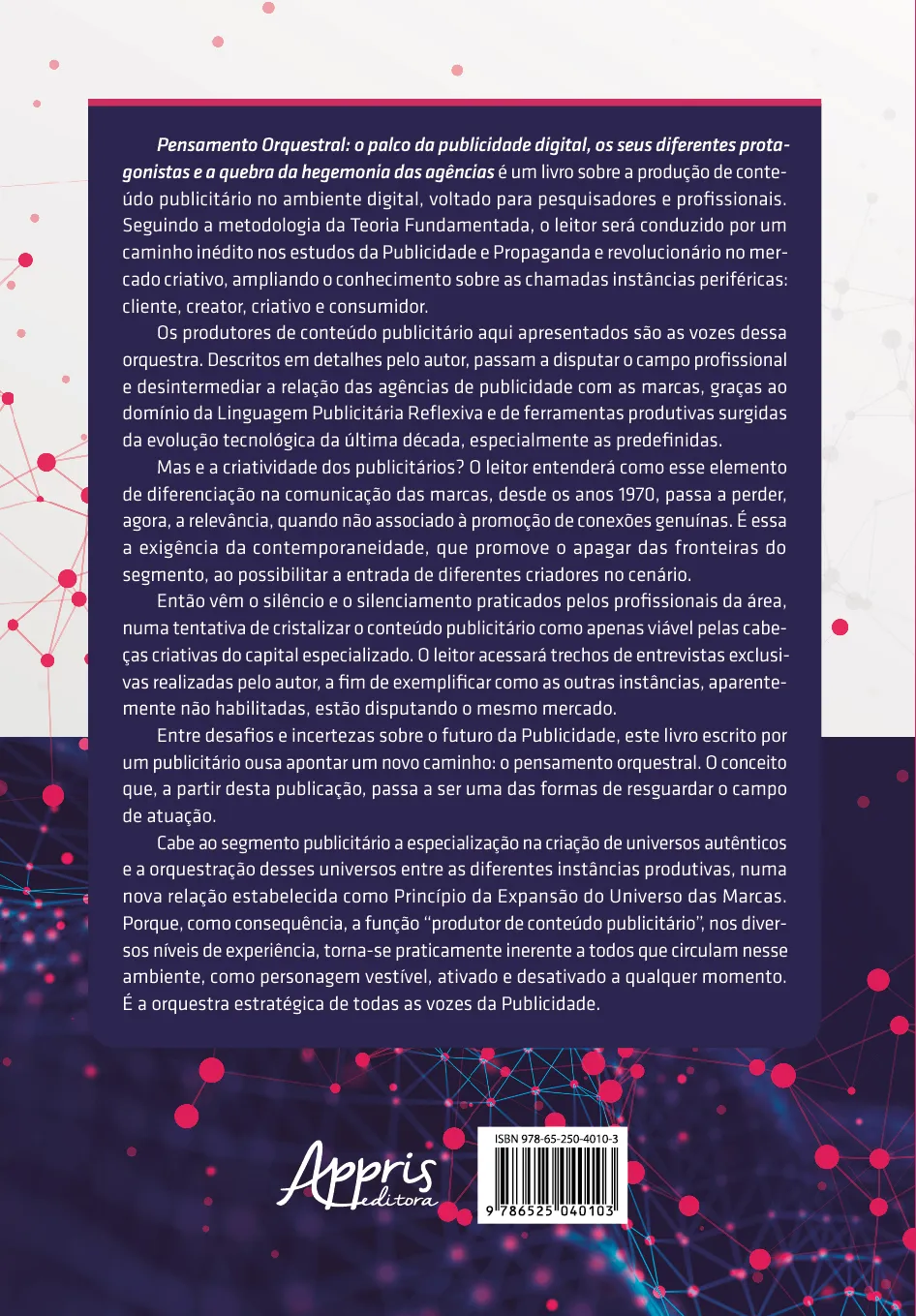 Pensamento Orquestral: o palco da publicidade digital, os seus diferentes protagonistas e a quebra da hegemonia das agências é um livro sobre a produção de conteúdo publicitário no ambiente digital, voltado para pesquisadores e profissionais. Seguindo a metodologia da Teoria Fundamentada, o leitor será conduzido por um caminho inédito nos estudos da Publicidade e Propaganda e revolucionário no mercado criativo, ampliando o conhecimento sobre as chamadas instâncias periféricas: cliente, creator, criativo e consumidor.
