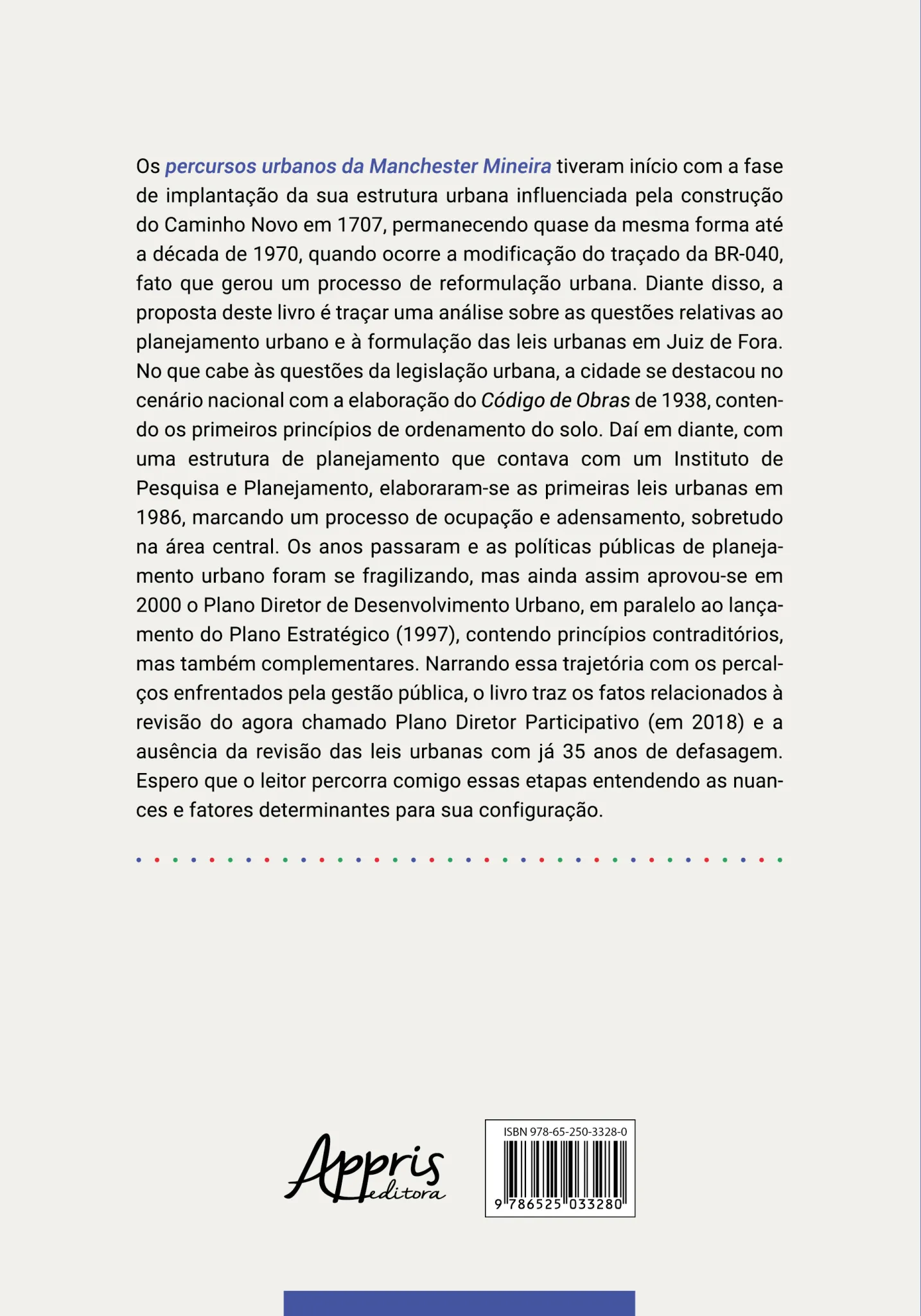 Os percursos urbanos da Manchester Mineira tiveram início com a fase de implantação da sua estrutura urbana influenciada pela construção do Caminho Novo em 1707, permanecendo quase da mesma forma até a década de 1970, quando ocorre a modificação do traçado da BR-040, fato que gerou um processo de reformulação urbana. Diante disso, a proposta deste livro é traçar uma análise sobre as questões relativas ao planejamento urbano e à formulação das leis urbanas em Juiz de Fora. No que cabe às questões da legislação urbana, a cidade se destacou no cenário nacional com a elaboração do Código de Obras de 1938, contendo os primeiros princípios de ordenamento do solo. Daí em diante, com uma estrutura de planejamento que contava com um Instituto de Pesquisa e Planejamento, elaboraram-se as primeiras leis urbanas em 1986, marcando um processo de ocupação e adensamento, sobretudo na área central. Os anos passaram e as políticas públicas de planejamento urbano foram se fragilizando, mas ainda assim aprovou-se em 2000 o Plano Diretor de Desenvolvimento Urbano, em paralelo ao lançamento do Plano Estratégico (1997), contendo princípios contraditórios, mas também complementares. Narrando essa trajetória com os percalços enfrentados pela gestão pública, o livro traz os fatos relacionados à revisão do agora chamado Plano Diretor Participativo (em 2018) e a ausência da revisão das leis urbanas com já 35 anos de defasagem. Espero que o leitor percorra comigo essas etapas entendendo as nuances e fatores determinantes para sua configuração.