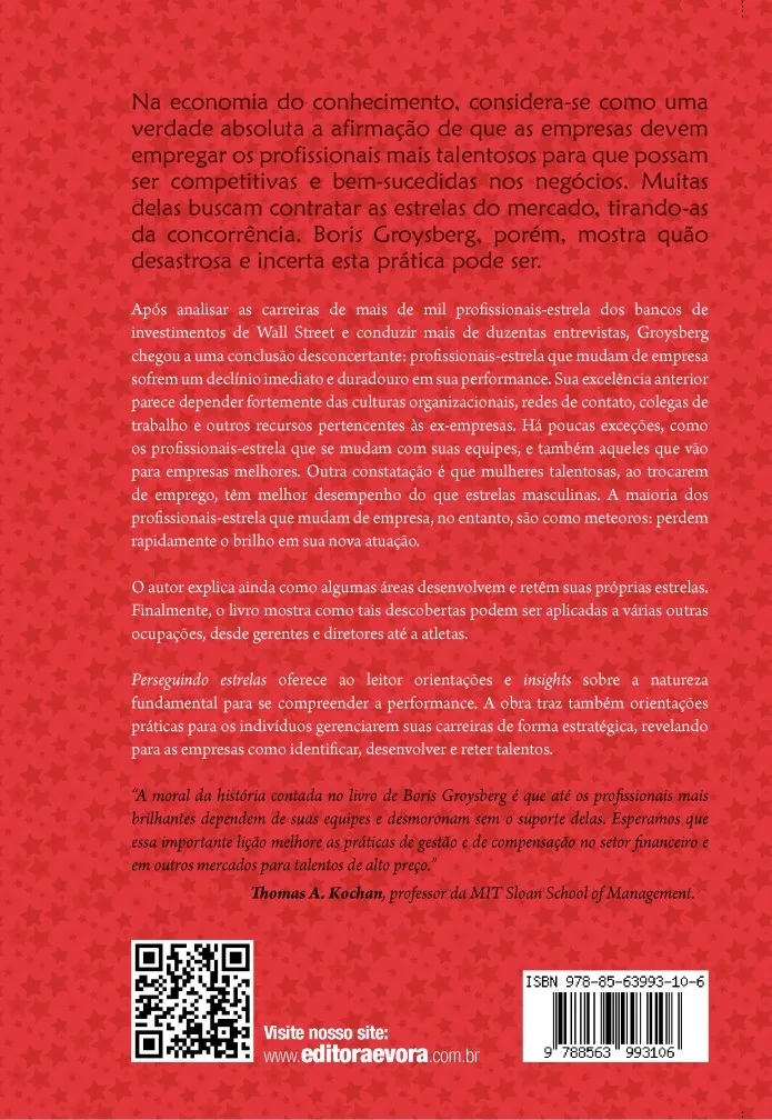 Após analisar as carreiras de mais de mil profissionais-estrela dos bancos de Investimentos de Wall Street, e conduzir mais de duzentas entrevistas, Groysberg chegou a uma conclusão desconcertante: profissionais-estrela que mudam de empresa sofrem um declínio imediato e duradouro na sua performance. Sua excelência anterior parece ter dependido fortemente das culturas organizacionais, redes de contato, colegas de trabalho e outros recursos pertencentes às suas ex-empresas. Há poucas exceções, como os profissionais-estrela que se mudam com suas equipes e aqueles os quais vão para companhias melhores. Outra constatação é que mulheres talentosas performam melhor do que estrelas masculinas ao trocarem de emprego. Mas, a maioria dos profissionais-estrela que mudam de empresa são como meteoros, perdendo rapidamente o brilho em sua nova atuação. O autor explica ainda como alguns departamentos de análise e pesquisa estão desenvolvendo e retendo suas próprias estrelas. Finalmente, o livro revela como tais descobertas podem ser aplicadas a várias outras ocupações, desde gerentes e diretores até atletas. Perseguindo Estrelas oferece ao leitor orientações e insights sobre a natureza fundamental para se compreender a performance.