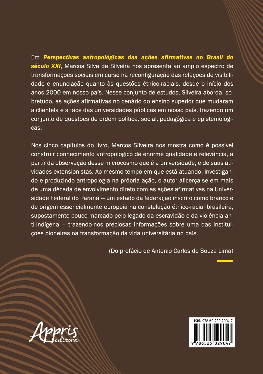 Em Perspectivas antropológicas das ações afirmativas no Brasil do século XXI, Marcos Silva da Silveira nos apresenta ao amplo espectro de transformações sociais em curso na reconfiguração das relações de visibilidade e enunciação quanto às questões étnico-raciais, desde o início dos anos 2000 em nosso país. Nesse conjunto de estudos, Silveira aborda, sobretudo, as ações afirmativas no cenário do ensino superior que mudaram a clientela e a face das universidades públicas em nosso país, trazendo um conjunto de questões de ordem política, social, pedagógica e epistemológicas.