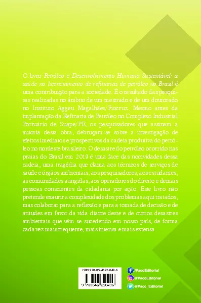Em “Petróleo e Desenvolvimento Humano Sustentável: a saúde no licenciamento de refinarias de petróleo no Brasil” encontraremos pesquisas de mestrado e de doutorado realizadas na Fiocruz. O grupo de pesquisadores que assinam a autoria desta obra, debruçam-se sobre a investigação de efeitos imediatos e prospectivos da cadeia produtiva do petróleo no nordeste brasileiro. O desastre do vazamento de petróleo ocorrido nas praias do Brasil em 2019 é uma das faces nocivas dessa cadeia, um desastre que clama por ações e pessoas conscientes. Esta publicação é destinada a pesquisadores, profissionais e interessados em buscar atitudes ambientais em favor da vida.