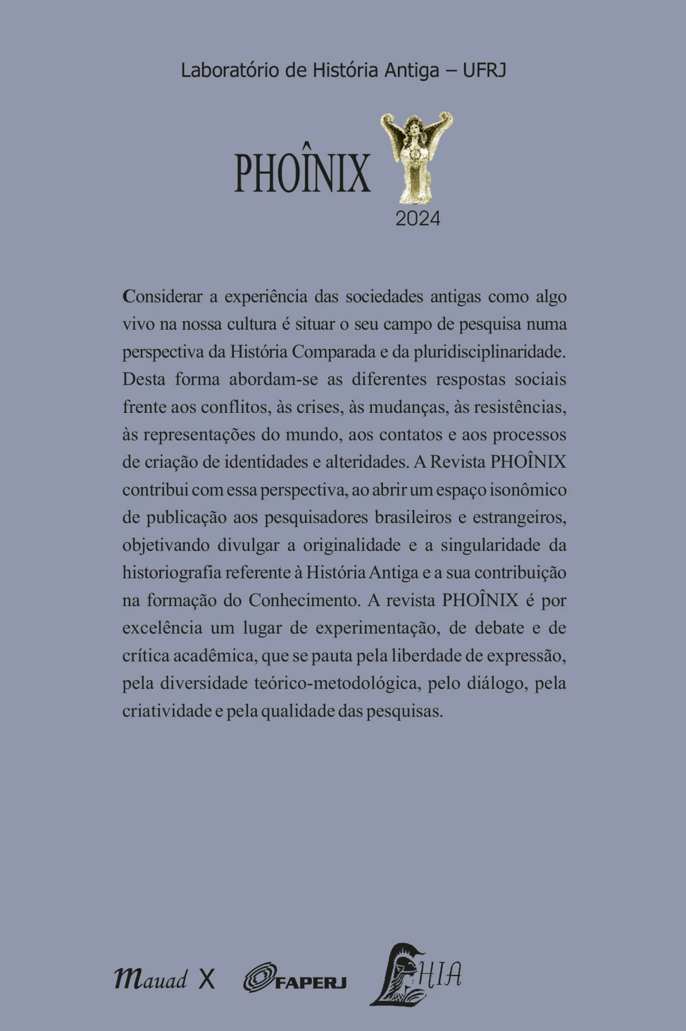 Seja em termos de criação ou de sua renovação, a História está em cons¬tante movimento. Buscando uma abordagem dinâmica e interdisciplinar que destaque a relevância contínua da Antiguidade para os dias atuais, o dossiê História Antiga em movimento – 30 anos do LHIA tem, portanto, a dupla função de fazer um balanço das contribuições historiográficas dos últimos 30 anos que marcaram o Laboratório de História Antiga (LHIA) da Univer¬sidade Federal do Rio de Janeiro (UFRJ), bem como fomentar as próximas pautas e discussões necessárias para a atualização do campo. Se há três dé¬cadas o Laboratório de História Antiga da UFRJ tem sido um local vibrante, de philía e vanguarda nos estudos da Antiguidade, esperamos que o presente dossiê possa celebrar os esforços coletivos do trabalho de antiquistas no país e a árdua consolidação de um campo de pesquisas sobre a Antiguidade que desafie noções convencionais e nos permita compreender melhor como o passado continua, em constante movimento, a moldar nosso presente. Os artigos que integram este número da Revista Phoînix propõem cumprir os objetivos destacados.