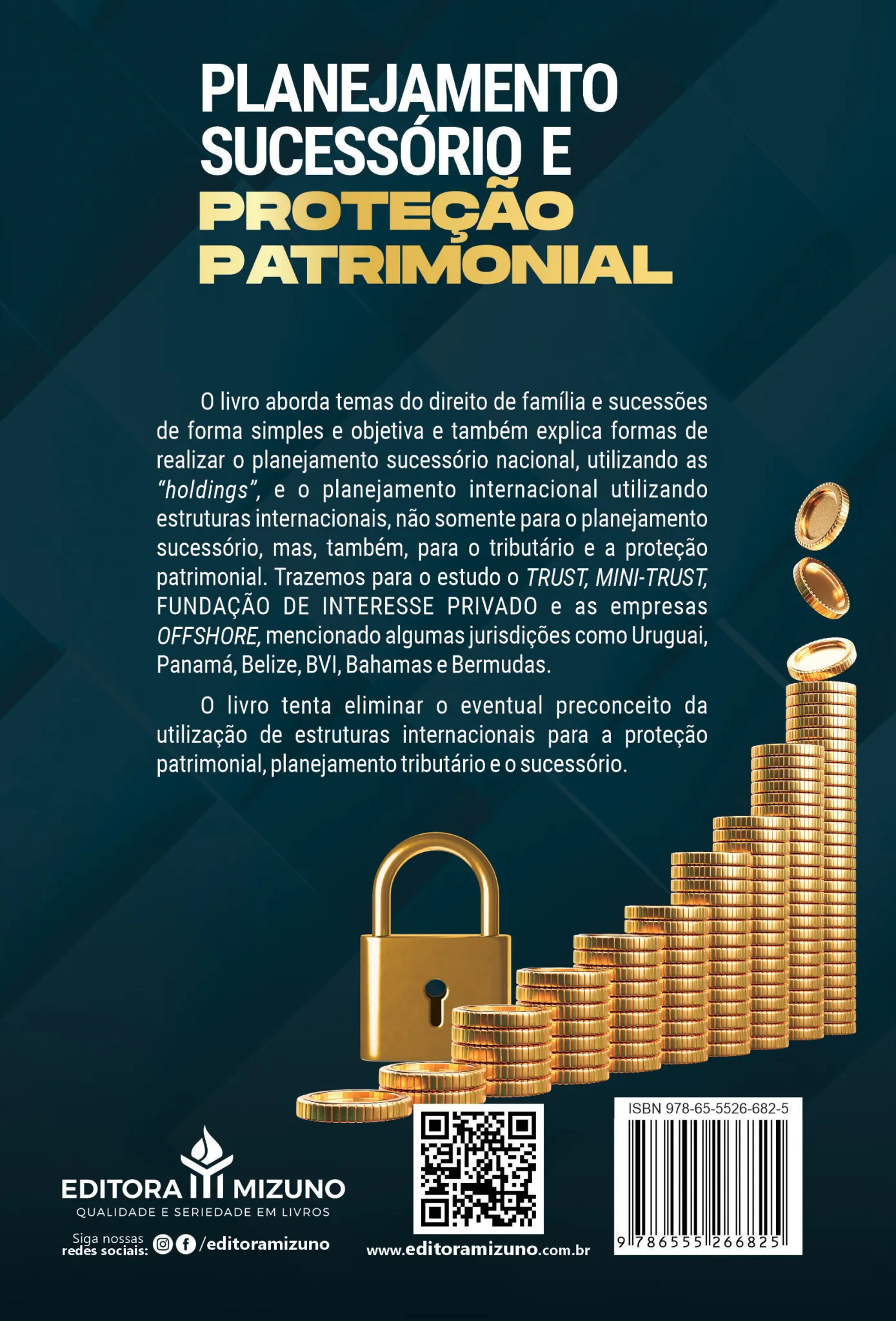 O livro aborda temas do direito de família e sucessões de forma simples e objetiva e também explica formas de realizar o planejamento sucessório nacional, utilizando as “holdings”, e o planejamento internacional utilizando estruturas internacionais, não somente para o planejamento sucessório, mas, também, para o tributário e a proteção patrimonial. Trazemos para o estudo o TRUST, MINI-TRUTS, FUNDAÇÃO DE INTERESSE PRIVADO e as empresas OFFSHORE, mencionado algumas jurisdições como Uruguai, Panamá, Belize, BVI, Bahamas e Bermudas.