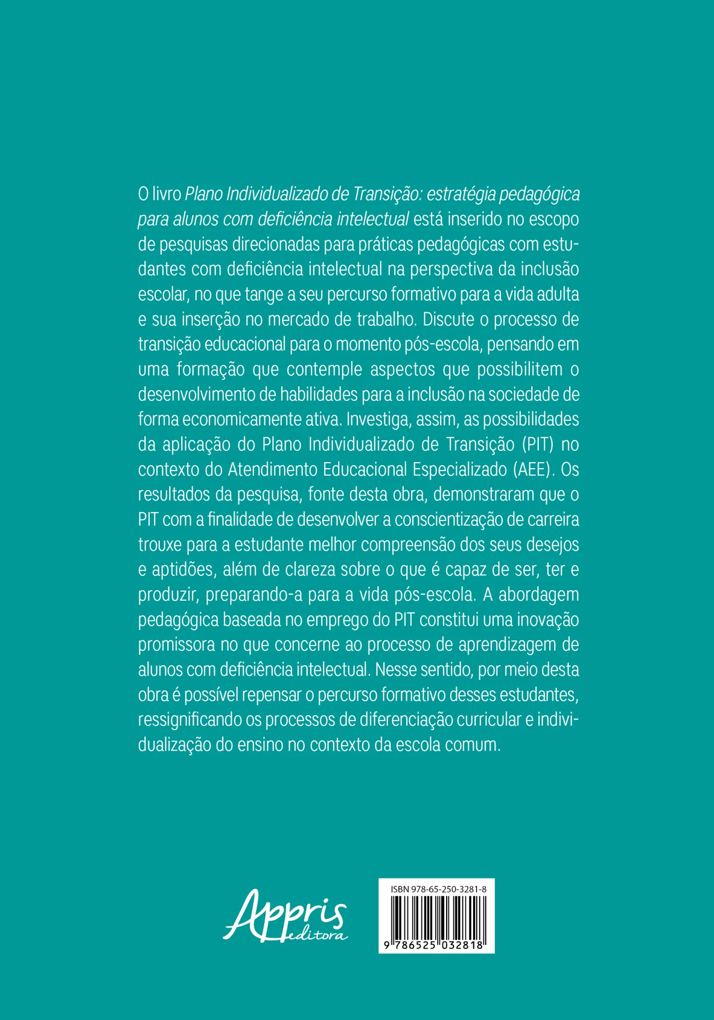 O livro Plano Individualizado de Transição: estratégia pedagógica para alunos com deficiência intelectual está inserido no escopo de pesquisas direcionadas para práticas pedagógicas com estudantes com deficiência intelectual na perspectiva da inclusão escolar, no que tange a seu percurso formativo para a vida adulta e sua inserção no mercado de trabalho. Discute o processo de transição educacional para o momento pós-escola, pensando em uma formação que contemple aspectos que possibilitem o desenvolvimento de habilidades para a inclusão na sociedade de forma economicamente ativa. Investiga, assim, as possibilidades da aplicação do Plano Individualizado de Transição (PIT) no contexto do Atendimento Educacional Especializado (AEE). Os resultados da pesquisa, fonte desta obra, demonstraram que o PIT com a finalidade de desenvolver a conscientização de carreira trouxe para a estudante melhor compreensão dos seus desejos e aptidões, além de clareza sobre o que é capaz de ser, ter e produzir, preparando-a para a vida pós-escola. A abordagem pedagógica baseada no emprego do PIT constitui uma inovação promissora no que concerne ao processo de aprendizagem de alunos com deficiência intelectual. Nesse sentido, por meio desta obra é possível repensar o percurso formativo desses estudantes, ressignificando os processos de diferenciação curricular e individualização do ensino no contexto da escola comum.