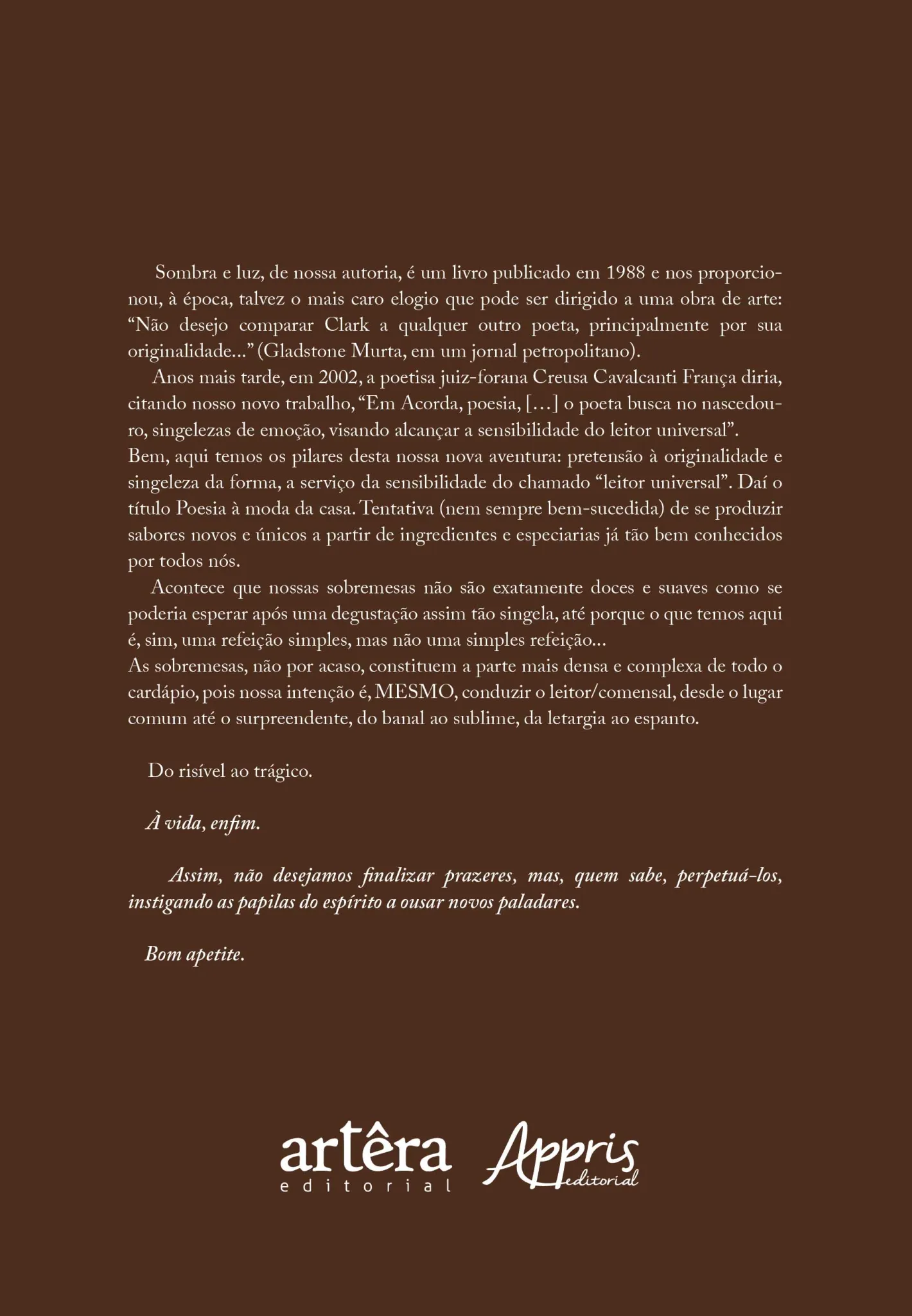 Bem, aqui temos os pilares desta nossa nova aventura: pretensão à originalidade e singeleza da forma, a serviço da sensibilidade do chamado “leitor universal”. Daí o título Poesia à moda da casa. Tentativa (nem sempre bem-sucedida) de se produzir sabores novos e únicos a partir de ingredientes e especiarias já tão bem conhecidos por todos nós.