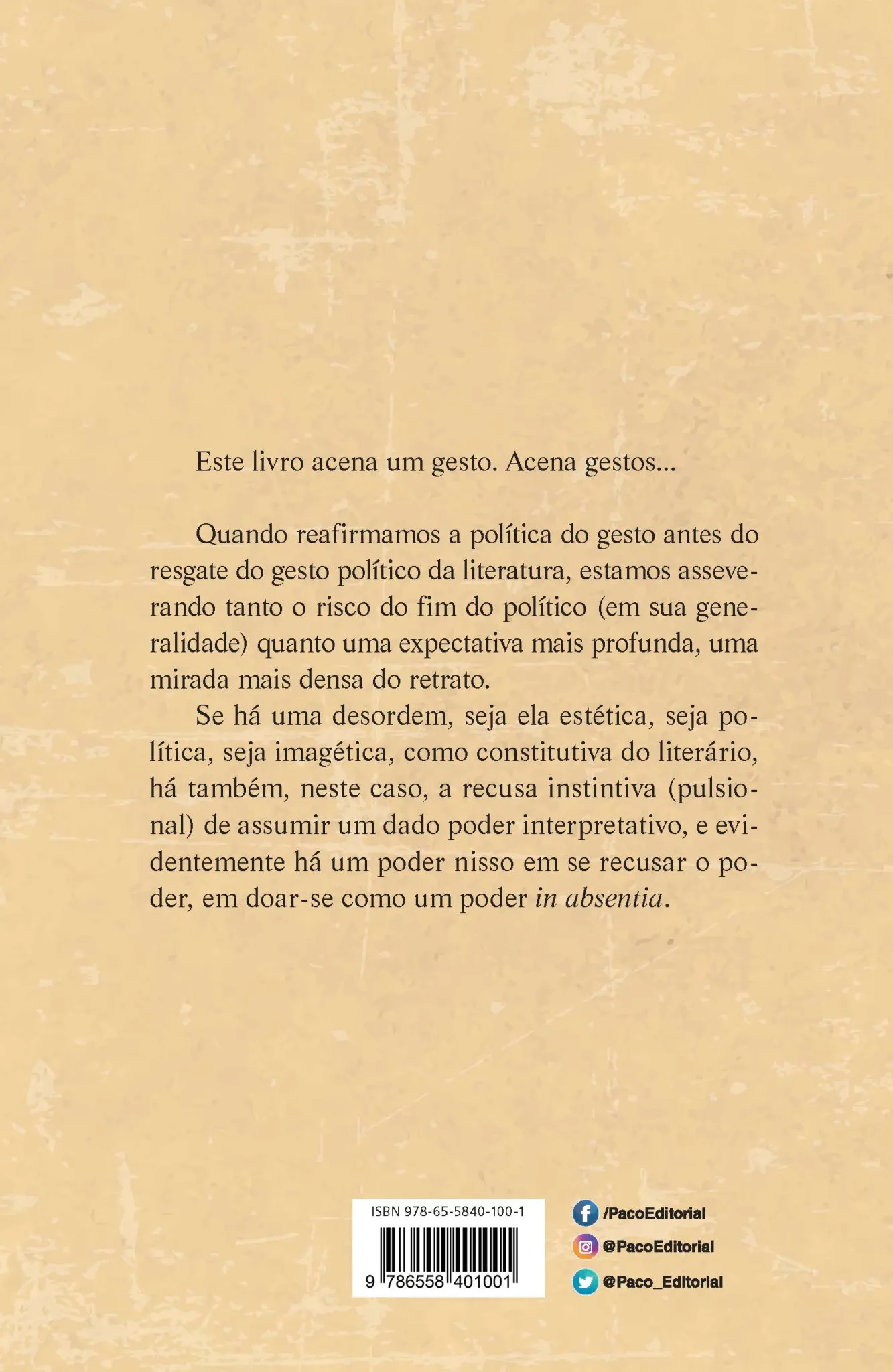 Poéticas como políticas do gesto, é uma obra com características interdisciplinar e poética, que conta com a colaboração vários autores, que ao longo da obra buscam descrever e analisar “interfaces entre poéticas e políticas”, “reafirmamos a política do gesto antes do resgate do gesto político da literatura”, os autores buscam desenvolver e analisar o tema de maneira profunda e valorizando a literatura e seu gesto político.