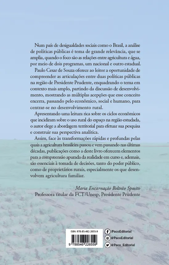 Num país de desigualdades sociais como o Brasil, a análise de políticas públicas é tema de grande relevância, que se amplia, quando o foco são as relações entre agricultura e água, por meio de dois programas, um nacional e outro estadual. Paulo Cesar de Souza oferece ao leitor a oportunidade de compreender as articulações entre duas políticas públicas na região de Presidente Prudente, enquadrando o tema em contexto mais amplo, partindo da discussão de desenvolvimento, mostrando as múltiplas acepções que esse conceito encerra, passando pelo econômico, social e humano, para centrar-se no desenvolvimento rural.