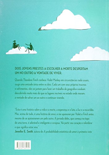 Agora um filme Netflix, estrelado por Elle Fanning e Justice Smith. Violet Markey tinha uma vida perfeita, mas todos os seus planos deixam de fazer sentido quando ela e a irmã sofrem um acidente de carro e apenas Violet sobrevive. Sentindo-se culpada pelo que aconteceu, a garota se afasta de todos e tenta descobrir como seguir em frente. Theodore Finch é o esquisito da escola, perseguido pelos valentões e chamado de “aberração” por onde passa. Para piorar, é obrigado a lidar com longos períodos de depressão, o pai violento e a apatia do resto da família. Enquanto Violet conta os dias para o fim das aulas, quando poderá ir embora da cidadezinha onde mora, Finch pesquisa diferentes métodos de suicídio e imagina se conseguiria levar algum deles adiante. Em uma dessas tentativas, ele vai parar no alto da torre da escola e, para sua surpresa, encontra Violet, também prestes a pular. Um ajuda o outro a sair dali, e essa dupla improvável se une para fazer um trabalho de geografia: conhecer lugares incríveis do estado onde moram. Ao lado de Finch, Violet para de contar os dias e finalmente passa a vivê-los. O garoto, por sua vez, encontra alguém com quem pode ser ele mesmo, e torce para que consiga se manter desperto. “Me apaixonei por Violet e Finch antes mesmo de se apaixonarem um pelo outro. A jornada deles é adorável e inteligente e corajosa. Vai partir seu coração e relembrar o que significa estar vivo.” — Jennifer E. Smith, autora de A probabilidade estatística do amor à primeira vista