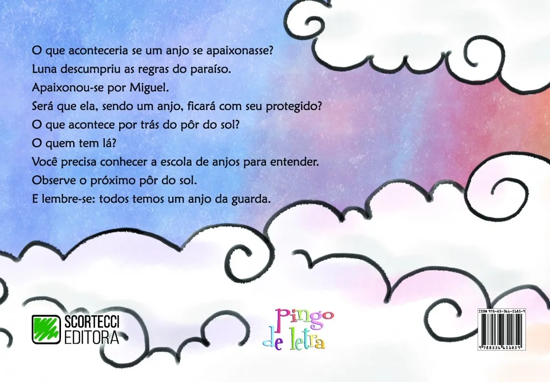 O que aconteceria se um anjo se apaixonasse? Luna descumpriu as regras do paraíso. Apaixonou-se por Miguel. Será que ela, sendo um anjo, ficará com seu protegido? O que acontece por trás do pôr do sol? O quem tem lá? Você precisa conhecer a escola de anjos para entender. Observe o próximo pôr do sol. E lembre-se: todos temos um anjo da guarda.