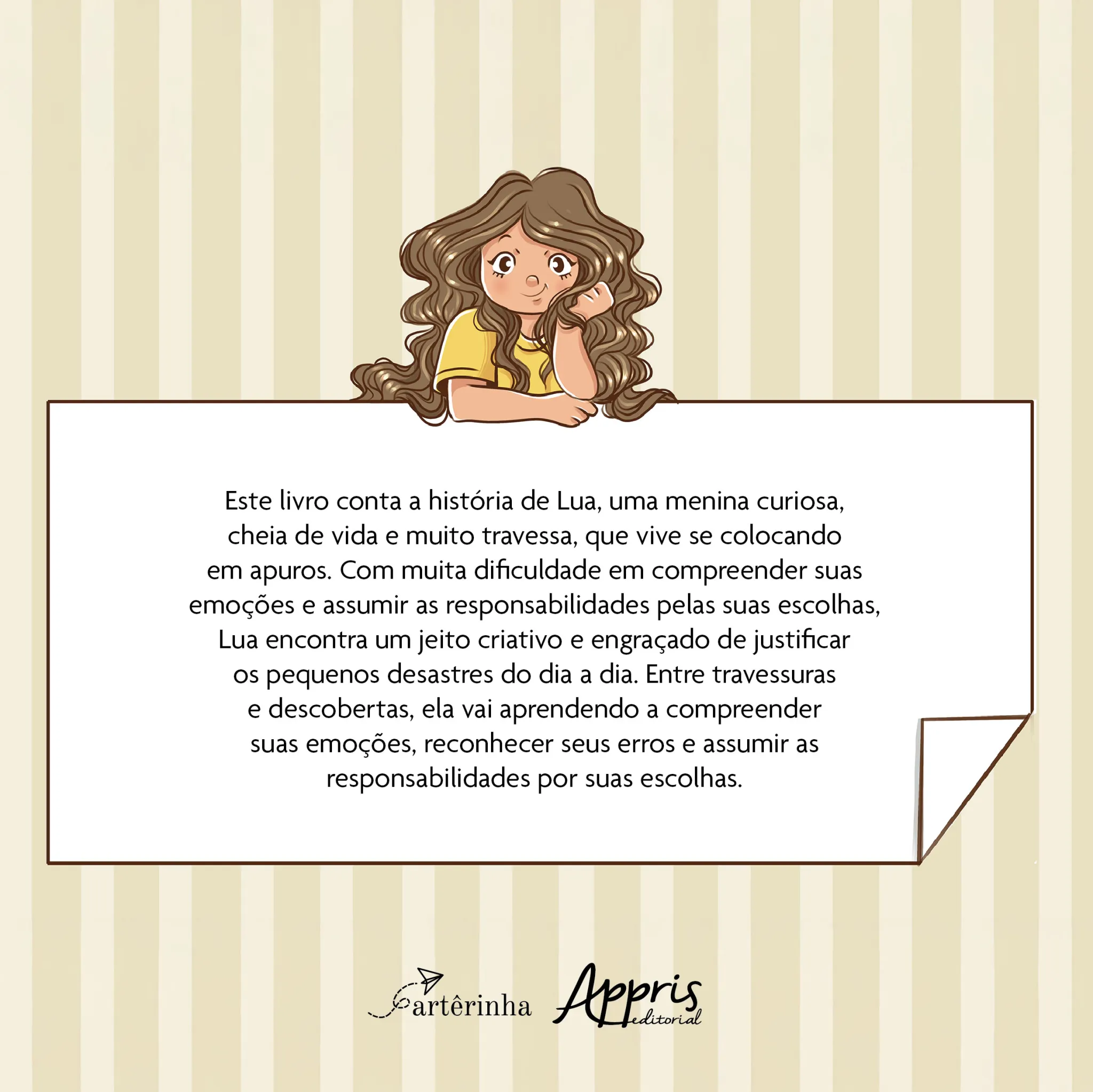 Este livro conta a história de Lua, uma menina curiosa, cheia de vida e muito travessa, que vive se colocando em apuros. Com muita dificuldade em compreender suas emoções e assumir as responsabilidades pelas suas escolhas, Lua encontra um jeito criativo e engraçado de justificar os pequenos desastres do dia a dia. Entre travessuras e descobertas, ela vai aprendendo a compreender suas emoções, reconhecer seus erros e assumir as responsabilidades por suas escolhas.
