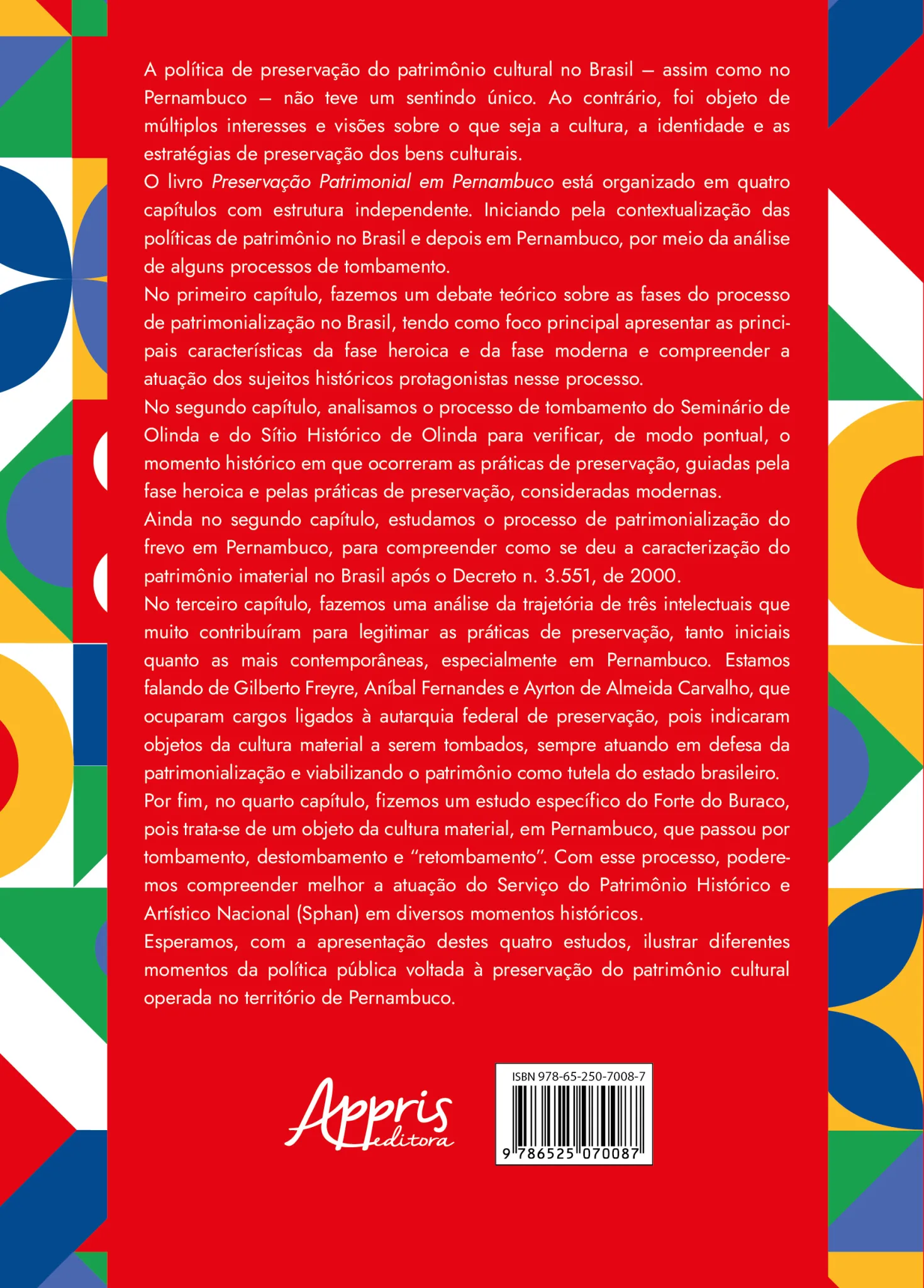 O livro Preservação Patrimonial em Pernambuco está organizado em quatro capítulos com estrutura independente. Iniciando pela contextualização das políticas de patrimônio no Brasil e depois em Pernambuco, por meio da análise de alguns processos de tombamento.
