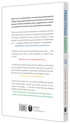 A consultora de produtividade do Google, Laura Mae Martin, fornece passos práticos para otimizar o uso do tempo, alcançar melhores resultados, evitar o esgotamento e cultivar um equilíbrio harmonioso entre vida profissional e pessoal. Todos os dias, dezenas de milhares de funcionários do Google — de executivos a estagiários — confiam nas dicas de Laura Mae Martin para aproveitar ao máximo o próprio tempo. Agora, com Produtividade saudável, Laura oferece sua abordagem única sobre produtividade e bem-estar a qualquer pessoa que queira ser mais eficiente com menos estresse. Laura começou sua carreira na área de vendas do Google, mas rapidamente conquistou seu próprio espaço como especialista em produtividade. Há mais de uma década, auxilia os Googlers a atingir um estado que ela chama de “produtividade zen”: uma abordagem inovadora que utiliza a tecnologia para tirar melhor proveito de seu tempo. Aqui, ela nos ensina a dar passos concretos na direção de nossas prioridades e a manter boa rotina e boas práticas. Os ensinamentos de Laura vão desde como superar a avalanche de e-mails em sua caixa de entrada até gerenciar o próprio calendário e organizar reuniões de forma eficaz, esteja você trabalhando presencialmente, de maneira remota ou em um esquema híbrido.