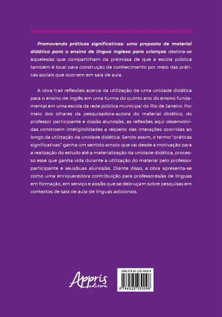 A obra traz reflexões acerca da utilização de uma unidade didática para o ensino de inglês em uma turma do quinto ano do ensino fundamental em uma escola da rede pública municipal do Rio de Janeiro. Por meio dos olhares da pesquisadora-autora do material didático, do professor participante e dos/as alunos/as, as reflexões aqui desenvolvidas constroem inteligibilidades a respeito das interações ocorridas ao longo da utilização da unidade didática. Sendo assim, o termo “práticas significativas” ganha um sentido amplo que vai desde a motivação para a realização do estudo até a materialização da unidade didática, processo esse que ganha vida durante a utilização do material pelo professor participante e seus/suas alunos/as. Diante disso, a obra apresenta-se como uma enriquecedora contribuição para professores/as de línguas em formação, em serviço e aos/às que se debruçam sobre pesquisas em contextos de sala de aula de línguas adicionais.