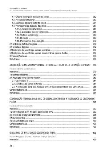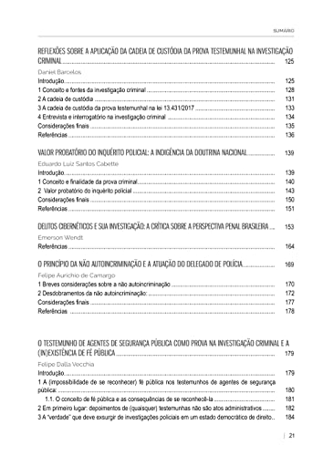 Os autores, integrantes das Polícias Civis e Polícia Federal, abordam temas que envolvem as provas obtidas e produzidas pela Polícia Judiciária, com grande relevância teórica e prática para o Direito Policial. Trata-se de uma obra indispensável para o conhecimento de temas pouco explorados pela doutrina, com reflexo no Poder Judiciário, Ministério Público e todos os demais atores do sistema de persecução penal e justiça criminal. O leitor encontrará artigos que mesclam experiência profissional com a profundidade e atualidade de temas voltados à instrução preliminar, alinhado a moderna doutrina e atualizada jurisprudência. É destinada a todos os estudantes de graduação e pós-graduação em Direito, Segurança Pública e Ciências Criminais, aos policiais civis, militares e federais, agentes de segurança pública e profissionais das carreiras jurídicas em geral, como também a todos que desejam se preparar para as provas de concursos públicos das carreiras policiais.