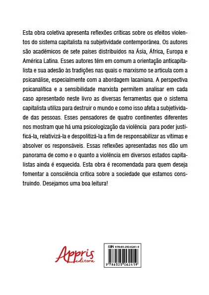 Esta obra coletiva apresenta reflexões críticas sobre os efeitos violentos do sistema capitalista na subjetividade contemporânea. Os autores são acadêmicos de sete países distribuídos na Ásia, África, Europa e América Latina. Esses autores têm em comum a orientação anticapitalista e sua adesão às tradições nas quais o marxismo se articula com a psicanálise, especialmente com a abordagem lacaniana. A perspectiva psicanalítica e a sensibilidade marxista permitem analisar em cada caso apresentado neste livro as diversas ferramentas que o sistema capitalista utiliza para destruir o mundo e como isso afeta a subjetividade das pessoas. Esses pensadores de quatro continentes diferentes nos mostram que há uma psicologização da violência para poder justificá-la, relativizá-la e despolitizá-la a fim de responsabilizar as vítimas e absolver os responsáveis. Essas reflexões apresentadas nos dão um panorama de como e o quanto a violência em diversos estados capitalistas ainda é esquecida. Psicanálise e Marxismo: As Violências em Tempos de Capitalismo é recomenda da para quem deseja fomentar a consciência crítica sobre a sociedade que estamos construindo. Desejamos uma boa leitura!