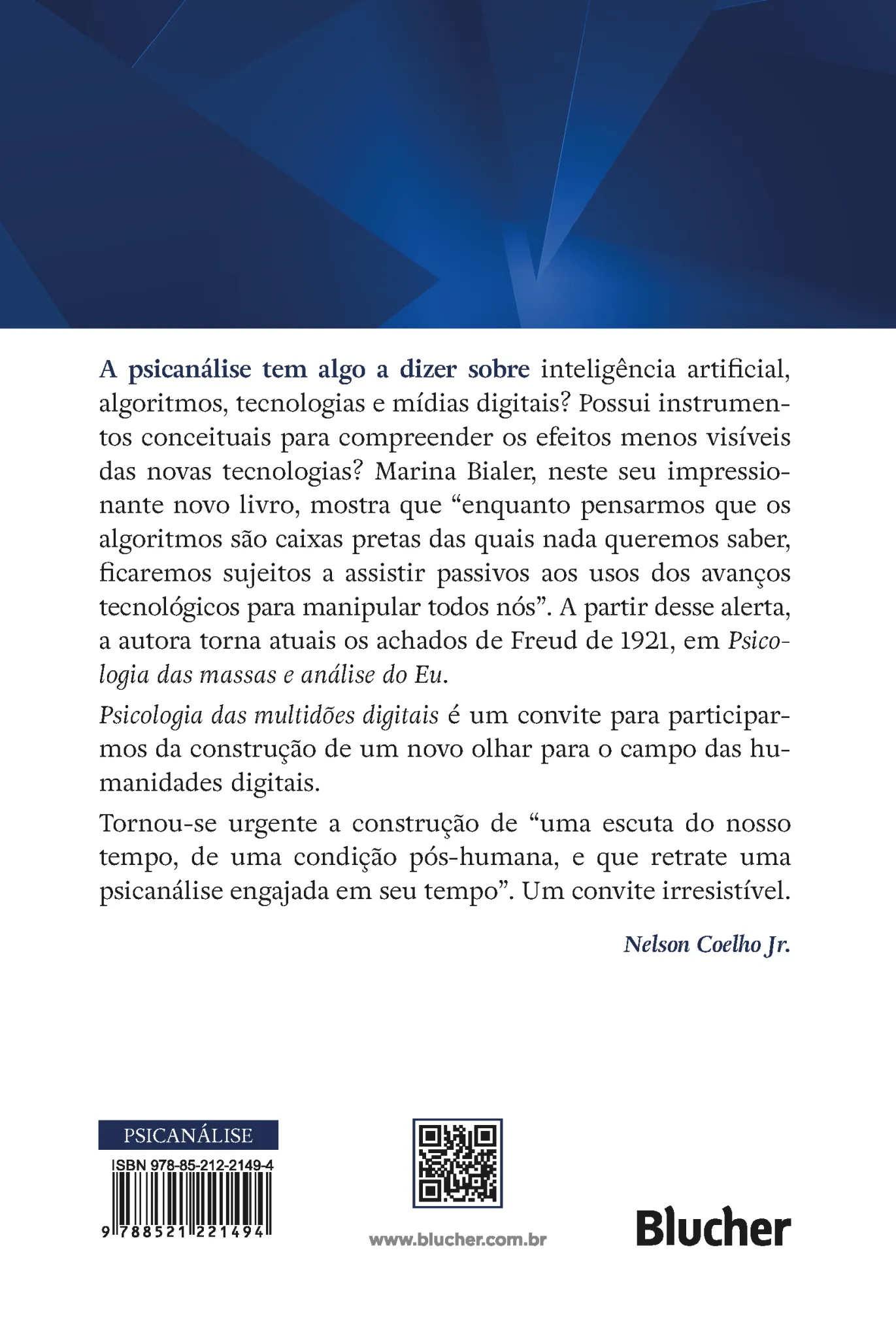 A psicanálise tem algo a dizer sobre inteligência artificial, algoritmos, tecnologias e mídias digitais? Possui instrumentos conceituais para compreender os efeitos menos visíveis das novas tecnologias? Marina Bialer, neste seu impressionante novo livro, mostra que “enquanto pensarmos que os algoritmos são caixas pretas das quais nada queremos saber, ficaremos sujeitos a assistir passivos aos usos dos avanços tecnológicos para manipular todos nós”. A partir desse alerta, a autora torna atuais os achados de Freud de 1921, em Psicologiadas massas e análise do Eu.Psicologia das multidões digitais é um convite para participarmos da construção de um novo olhar para o campo das humanidades digitais.Tornou-se urgente a construção de “uma escuta do nosso tempo, de uma condição pós-humana, e que retrate uma psicanálise engajada em seu tempo”. Um convite irresistível.– Nelson Coelho Jr.