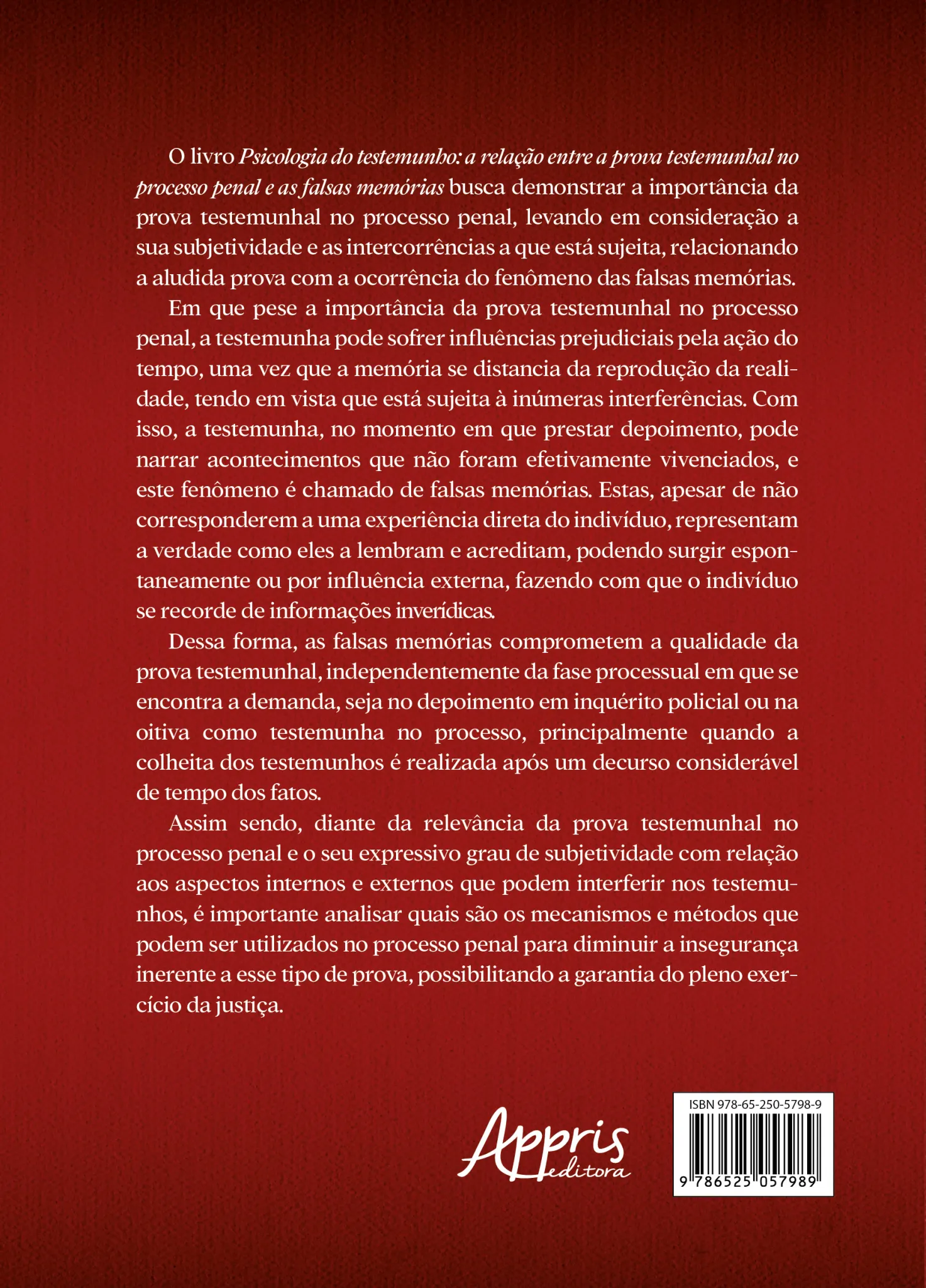 O livro Psicologia do testemunho: a relação entre a prova testemunhal no processo penal e as falsas memórias busca demonstrar a importância da prova testemunhal no processo penal, levando em consideração a sua subjetividade e as intercorrências a que está sujeita, relacionando a aludida prova com a ocorrência do fenômeno das falsas memórias. Em que pese a importância da prova testemunhal no processo penal, a testemunha pode sofrer influências prejudiciais pela ação do tempo, uma vez que a memória se distancia da reprodução da realidade, tendo em vista que está sujeita à inúmeras interferências. Com isso, a testemunha, no momento em que prestar depoimento, pode narrar acontecimentos que não foram efetivamente vivenciados, e este fenômeno é chamado de falsas memórias. Estas, apesar de não corresponderem a uma experiência direta do indivíduo, representam a verdade como eles a lembram e acreditam, podendo surgir espontaneamente ou por influência externa, fazendo com que o indivíduo se recorde de informações inverídicas. Dessa forma, as falsas memórias comprometem a qualidade da prova testemunhal, independentemente da fase processual em que se encontra a demanda, seja no depoimento em inquérito policial ou na oitiva como testemunha no processo, principalmente quando a colheita dos testemunhos é realizada após um decurso considerável de tempo dos fatos. Assim sendo, diante da relevância da prova testemunhal no processo penal e o seu expressivo grau de subjetividade com relação aos aspectos internos e externos que podem interferir nos testemunhos, é importante analisar quais são os mecanismos e métodos que podem ser utilizados no processo penal para diminuir a insegurança inerente a esse tipo de prova, possibilitando a garantia do pleno exercício da justiça.