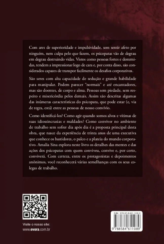 Como identifica-los? Como agir quando somos alvos e vítimas de suas idiossincrasias e maldades? Como conviver no ambiente de trabalho sem sofrer dia após dia é a proposta principal desta obra, que nasce da experiência de trinta anos de uma executiva que conhece os bastidores, o placo e a plateia do mundo corporativo. Amália Sina explora neste livro os detalhes das mentes e das ações dos psicopatas com quem conviveu, convive e, por certo, conviverá. Com certeza, entre os protagonistas e depoimentos anônimos, você reconhecera várias semelhanças com os seus colegas de trabalho.