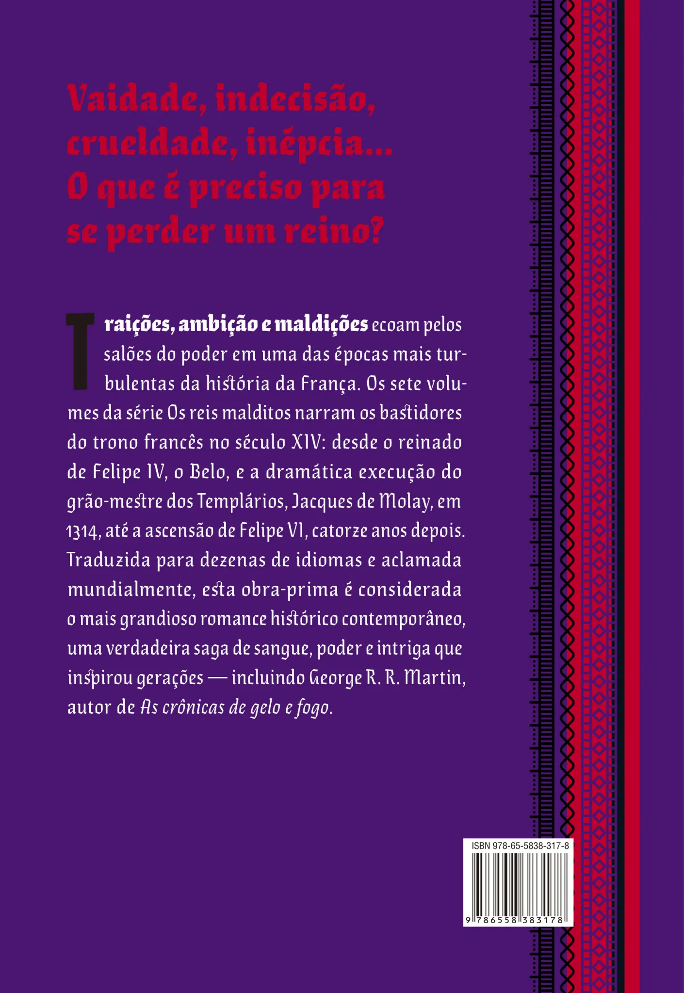 Traições, ambição e maldições ecoam pelos salões do poder em uma das épocas mais turbulentas da história da França. Os sete volumes da série Os reis malditos narram os bastidores do trono francês no século XIV — desde o reinado de Felipe IV, o Belo, e a dramática execução do grão-mestre dos Templários, Jacques de Molay, em 1314, até a ascensão de Felipe VI, catorze anos depois. Traduzida em dezenas de idiomas e aclamada mundialmente, esta obra-prima é considerada o mais grandioso romance histórico contemporâneo, uma verdadeira saga de sangue, poder e intriga que inspirou gerações.