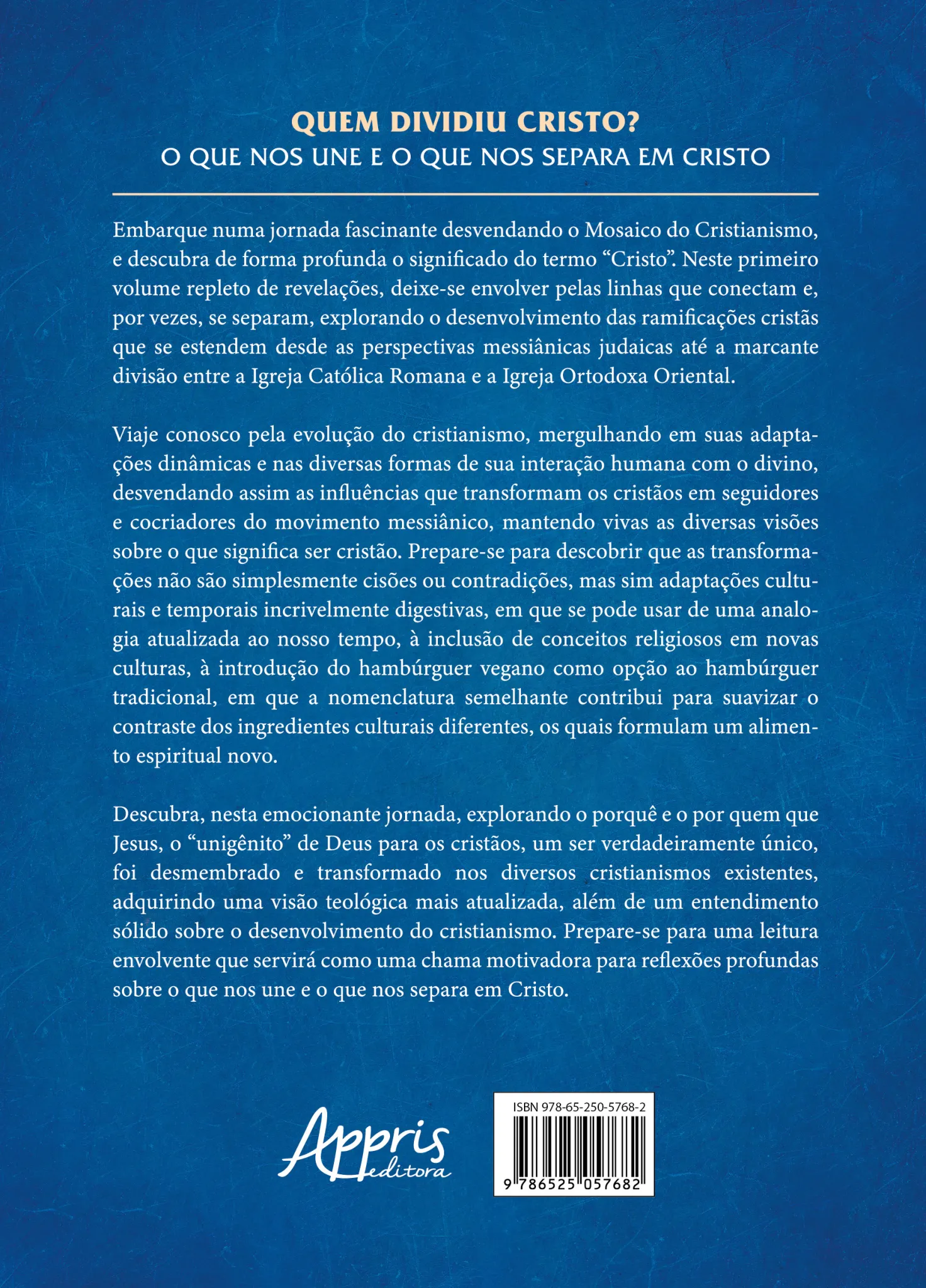 Quem dividiu Cristo? O que nos une e o que nos separa em Cristo Embarque numa jornada fascinante desvendando o Mosaico do Cristianismo, e descubra de forma profunda o significado do termo “Cristo”. Neste primeiro volume repleto de revelações, deixe-se envolver pelas linhas que conectam e, por vezes, se separam, explorando o desenvolvimento das ramificações cristãs que se estendem desde as perspectivas messiânicas judaicas até a marcante divisão entre a Igreja Católica Romana e a Igreja Ortodoxa Oriental. Viaje conosco pela evolução do cristianismo, mergulhando em suas adaptações dinâmicas e nas diversas formas de sua interação humana com o divino, desvendando assim as influências que transformam os cristãos em seguidores e cocriadores do movimento messiânico, mantendo vivas as diversas visões sobre o que significa ser cristão. Prepare-se para descobrir que as transformações não são simplesmente cisões ou contradições, mas sim adaptações culturais e temporais incrivelmente digestivas, em que se pode usar de uma analogia atualizada ao nosso tempo, à inclusão de conceitos religiosos em novas culturas, à introdução do hambúrguer vegano como opção ao hambúrguer tradicional, em que a nomenclatura semelhante contribui para suavizar o contraste dos ingredientes culturais diferentes, os quais formulam um alimento espiritual novo. Descubra, nesta emocionante jornada, explorando o porquê e o por quem que Jesus, o “unigênito” de Deus para os cristãos, um ser verdadeiramente único, foi desmembrado e transformado nos diversos cristianismos existentes, adquirindo uma visão teológica mais atualizada, além de um entendimento sólido sobre o desenvolvimento do cristianismo. Prepare-se para uma leitura envolvente que servirá como uma chama motivadora para reflexões profundas sobre o que nos une e o que nos separa em Cristo.