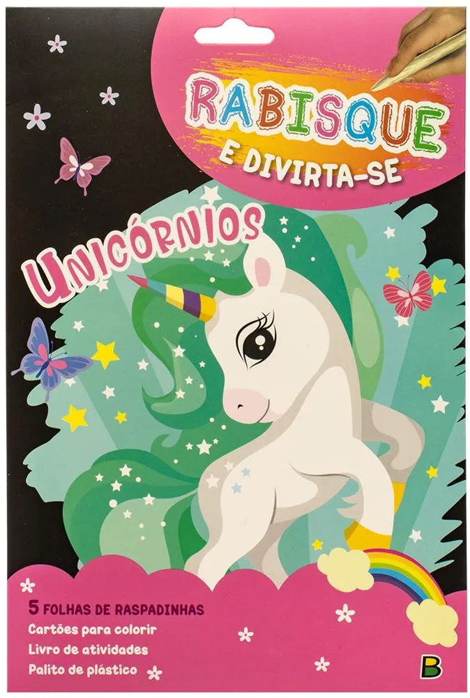 Vamos conhecer os unicórnios mágicos. Comece resolvendo as atividades do livreto. Em seguida, raspe a camada preta com o paliti e descubra uma ilustração colorida. Por fim, pinte o desenho do outro lado.
