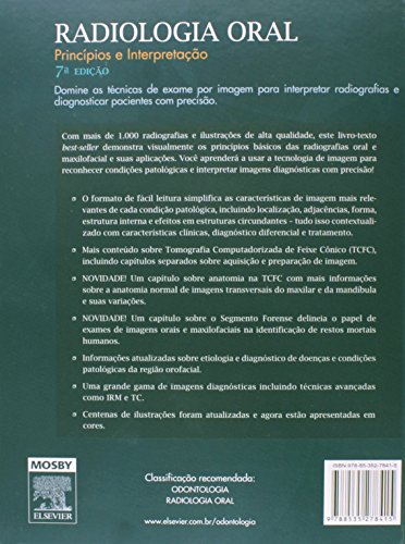 Domine as técnicas de exame por imagem, interprete radiografias e diagnostique pacientes com precisão com a nova edição do livro-texto best-seller em radiologia oral! Você aprenderá a usar a tecnologia de imagem para reconhecer condições patológicas e interpretar imagens diagnósticas com precisão com as mais de 1.000 radiografias e ilustrações de alta qualidade, que demonstram visualmente os princípios básicos das radiografias oral e maxilofacial e suas aplicações. Conheça as novidades da nova edição: Mais conteúdo sobre Tomografia Computadorizada de Feixe Cônico (TCFC), incluindo capítulos separados sobre aquisição e preparação de imagem; Um capítulo sobre anatomia na TCFC com mais informações sobre a anatomia normal de imagens transversias do maxilar e da mandíbula e suas variaçãos; Um capítulo sobre o segmento Forense delineia o papel de exames de imagens orais e maxilofaciais na identificação de restos mortais humanos; Informações atualizadas sobre etiologia e diagnóstico de doenças e condições patológicas da região orofacial; Ilustrações atualizadas e agora, em cores. Uma grande gama de imagens diagnósticas incluindo técnicas avançadas como IRM e TC.
