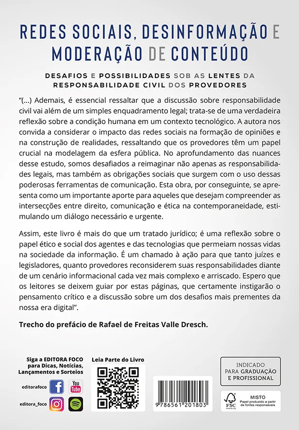 “(…) Ademais, é essencial ressaltar que a discussão sobre responsabilidade civil vai além de um simples enquadramento legal; trata-se de uma verdadeira reflexão sobre a condição humana em um contexto tecnológico. A autora nos convida a considerar o impacto das redes sociais na formação de opiniões e na construção de realidades, ressaltando que os provedores têm um papel crucial na modelagem da esfera pública. No aprofundamento das nuances desse estudo, somos desafiados a reimaginar não apenas as responsabilidades legais, mas também as obrigações sociais que surgem com o uso dessas poderosas ferramentas de comunicação. Esta obra, por conseguinte, se apresenta como um importante aporte para aqueles que desejam compreender as intersecções entre direito, comunicação e ética na contemporaneidade, estimulando um diálogo necessário e urgente.